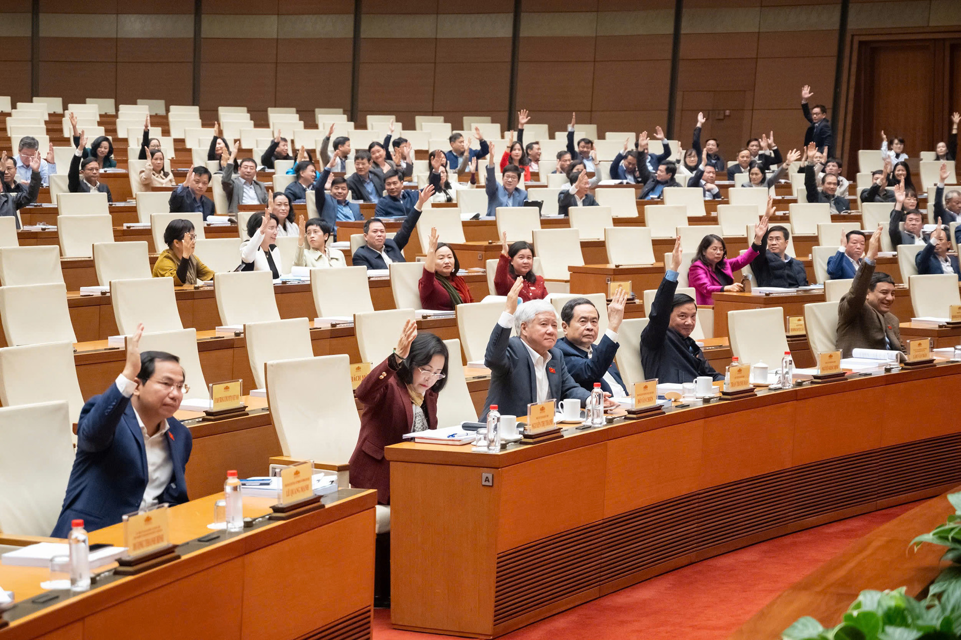 Hội nghị đã biểu quyết, nhất trí 100% thông qua danh sách 122 nhân sự được giới thiệu ứng cử đại biểu Quốc hội hoạt động chuyên trách khóa 16 ở Trung ương. Ảnh: Minh Nhật