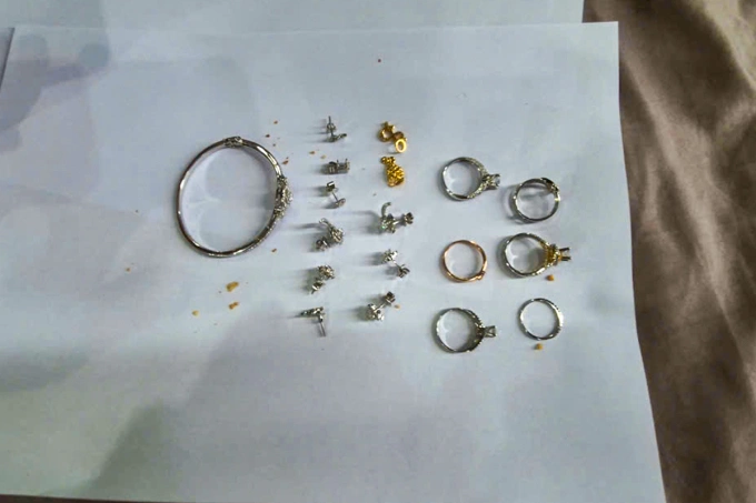 Khám xét nơi ở của nghi phạm, cảnh sát thu giữ số nữ trang tang vật Jame giấu trên trần thạch cao nhà vệ sinh, cùng nhiều vật chứng khác như đồng hồ, lắc vàng.