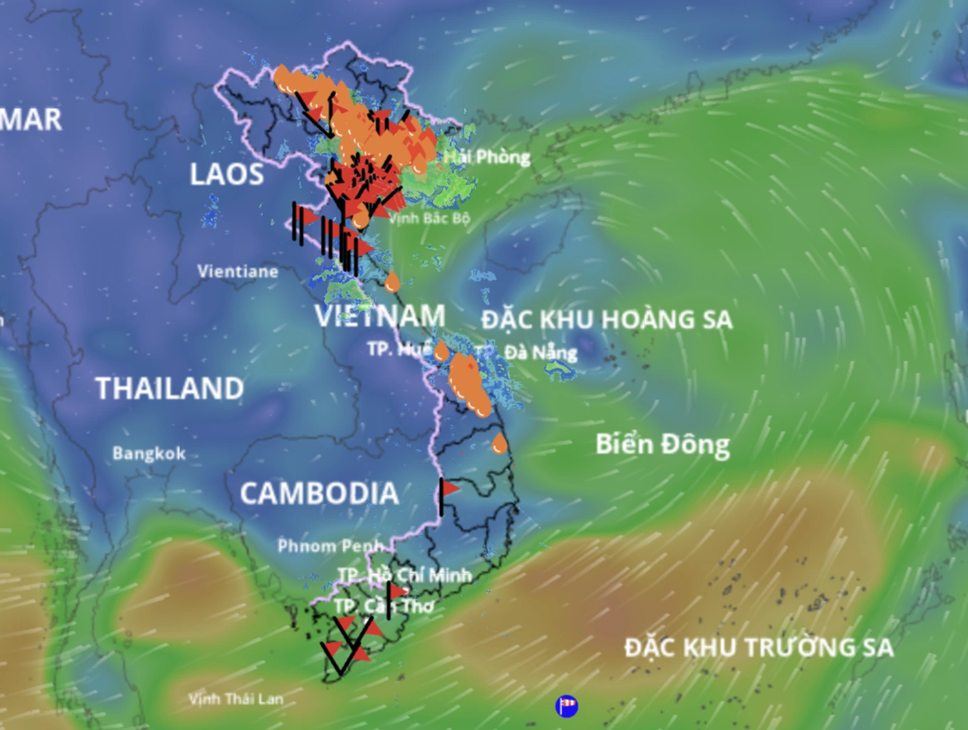 Ở trạm Huyền Trân (TPHCM) có gió Tây Nam mạnh cấp 6, giật cấp 9, trạm Trường Sa (Khánh Hoà) có gió giật mạnh cấp 7.