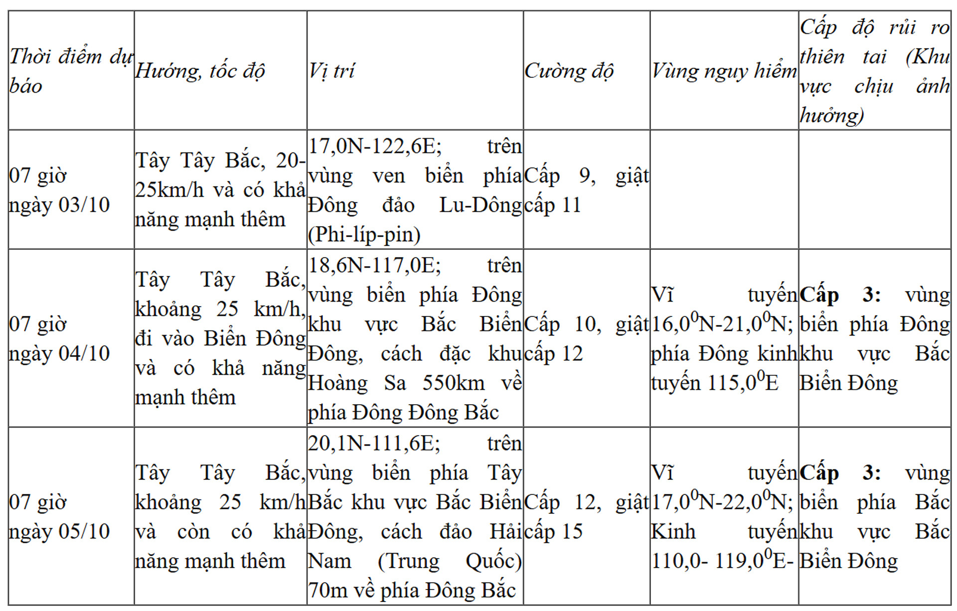 Do ảnh hưởng của bão, từ chiều 3/10, vùng biển phía Đông khu vực Bắc Biển Đông có gió mạnh dần lên cấp 6-7; sau tăng lên cấp 8, vùng gần tâm bão đi qua mạnh cấp 9-10, giật cấp 12, sóng biển cao 4-6m. Biển động rất mạnh.