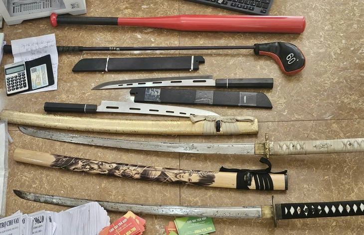 Số tang vật thu giữ tại nhà nghi phạm liên quan đến vụ cho vay lãi nặng có nhiều dao kiếm - Ảnh: Q.NAM