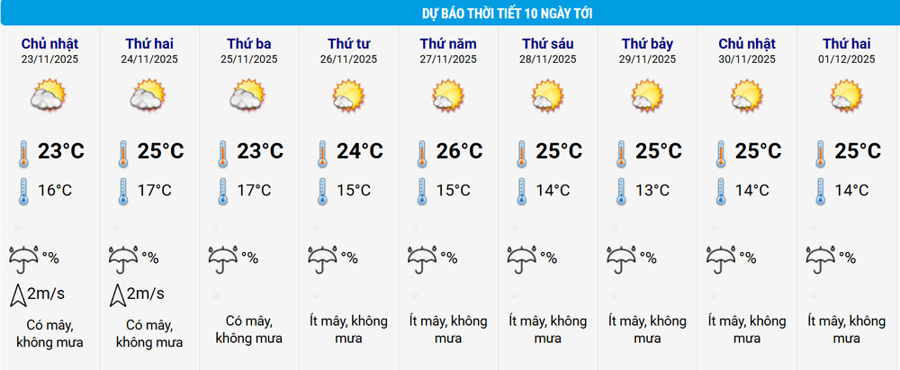 Đài khí tượng thủy văn Nam Bộ vừa đưa ra nhận định hình thế thời tiết trong 10 ngày tới (22/11-2/12/2025). Theo đó, không khí lạnh có cường độ ổn định, khoảng ngày 24-25/11 được tăng cường lệch đông trở lại phía bắc nước ta. Trên cao, áp cao cận nhiệt đới có trục qua Trung Bộ, khoảng ngày 26/11 hoạt động suy yếu.