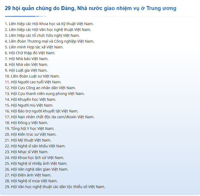 Bộ Chính trị, Ban Bí thư thống nhất danh sách 29 hội quần chúng do Đảng, Nhà nước giao nhiệm vụ ở Trung ương.