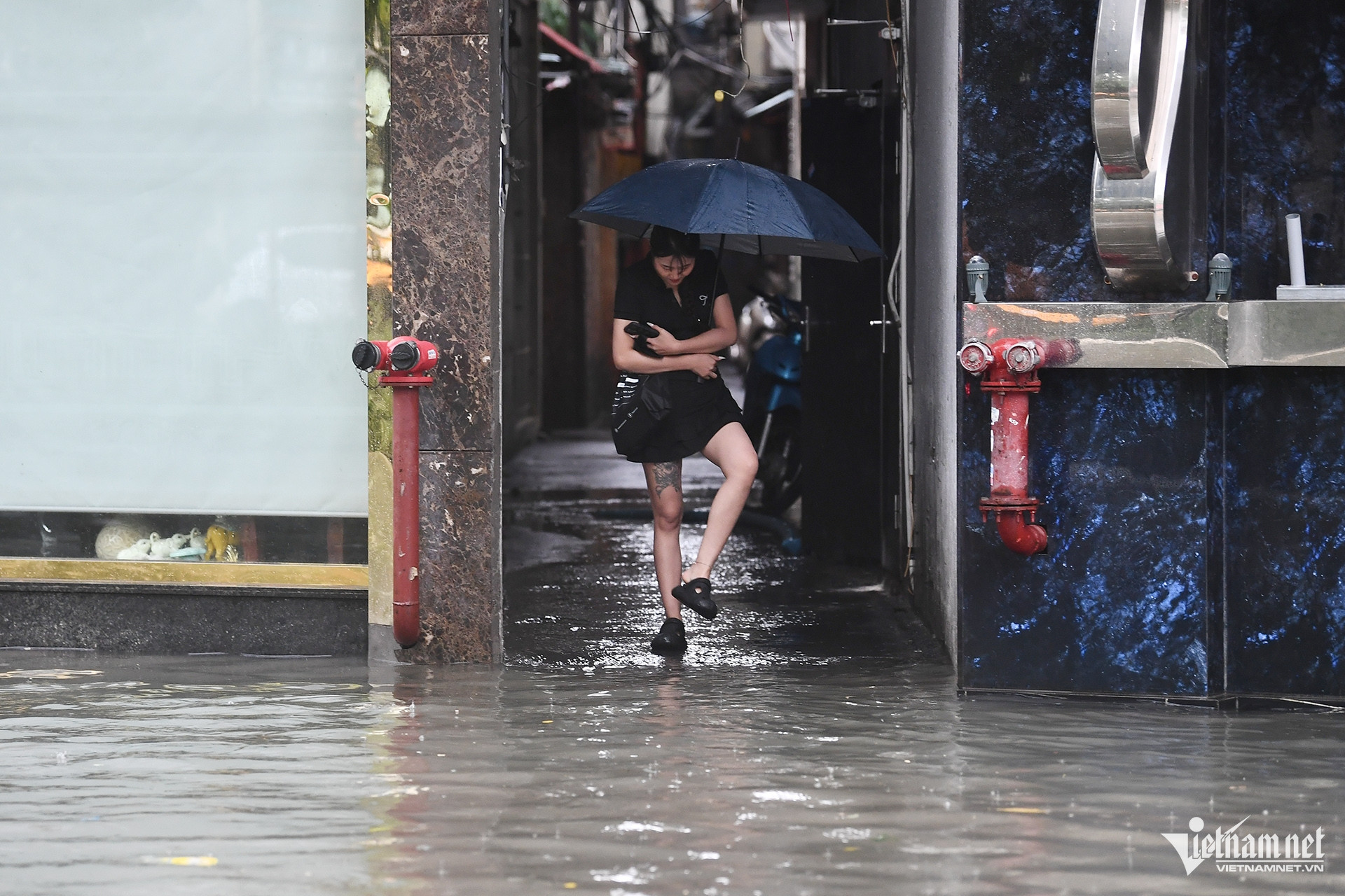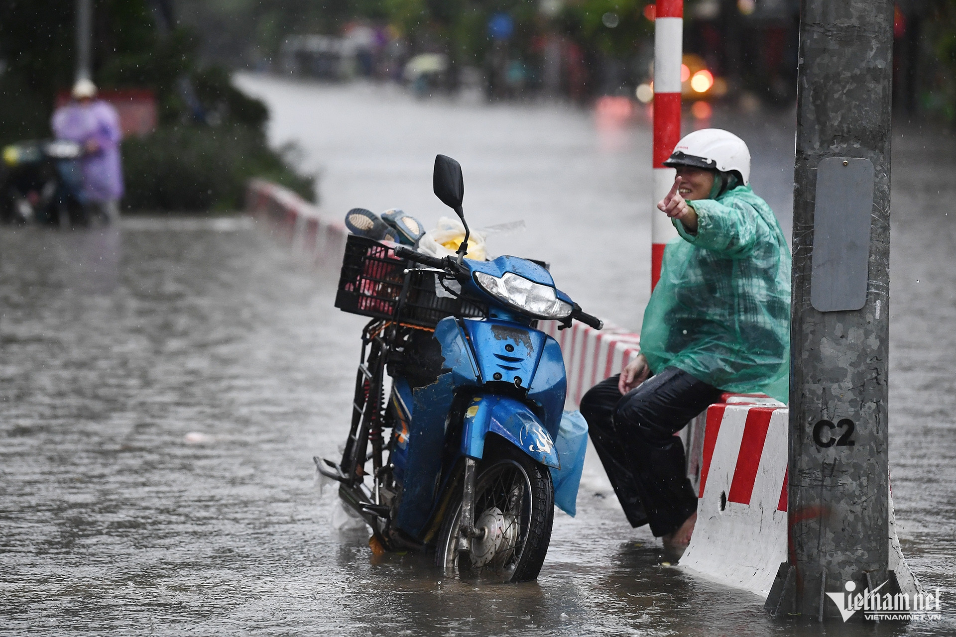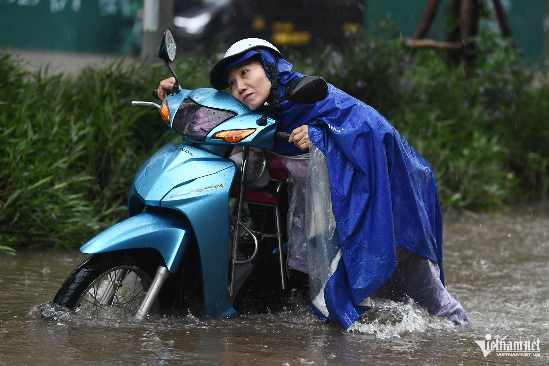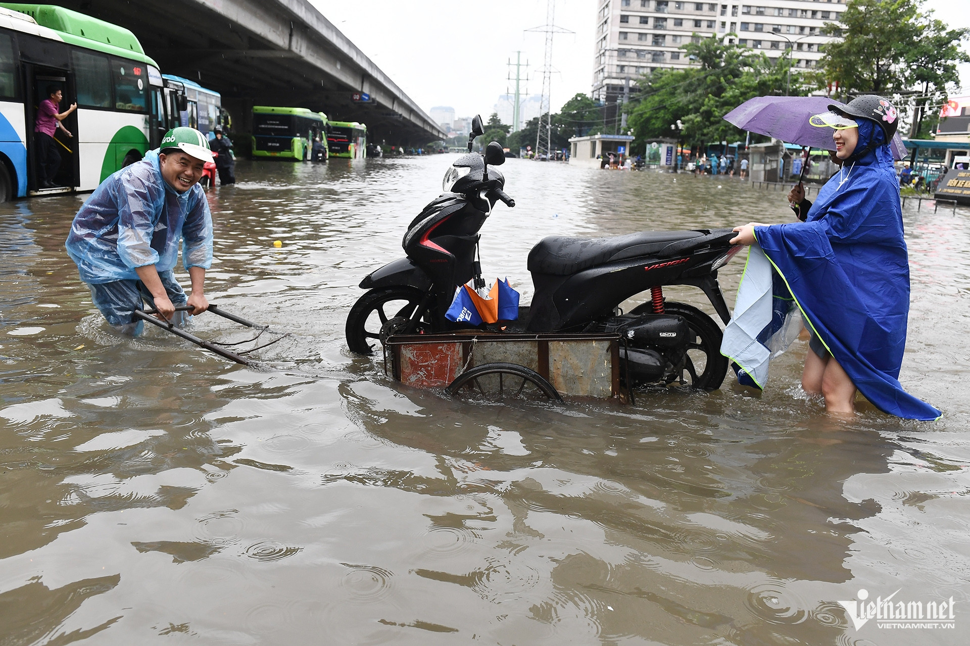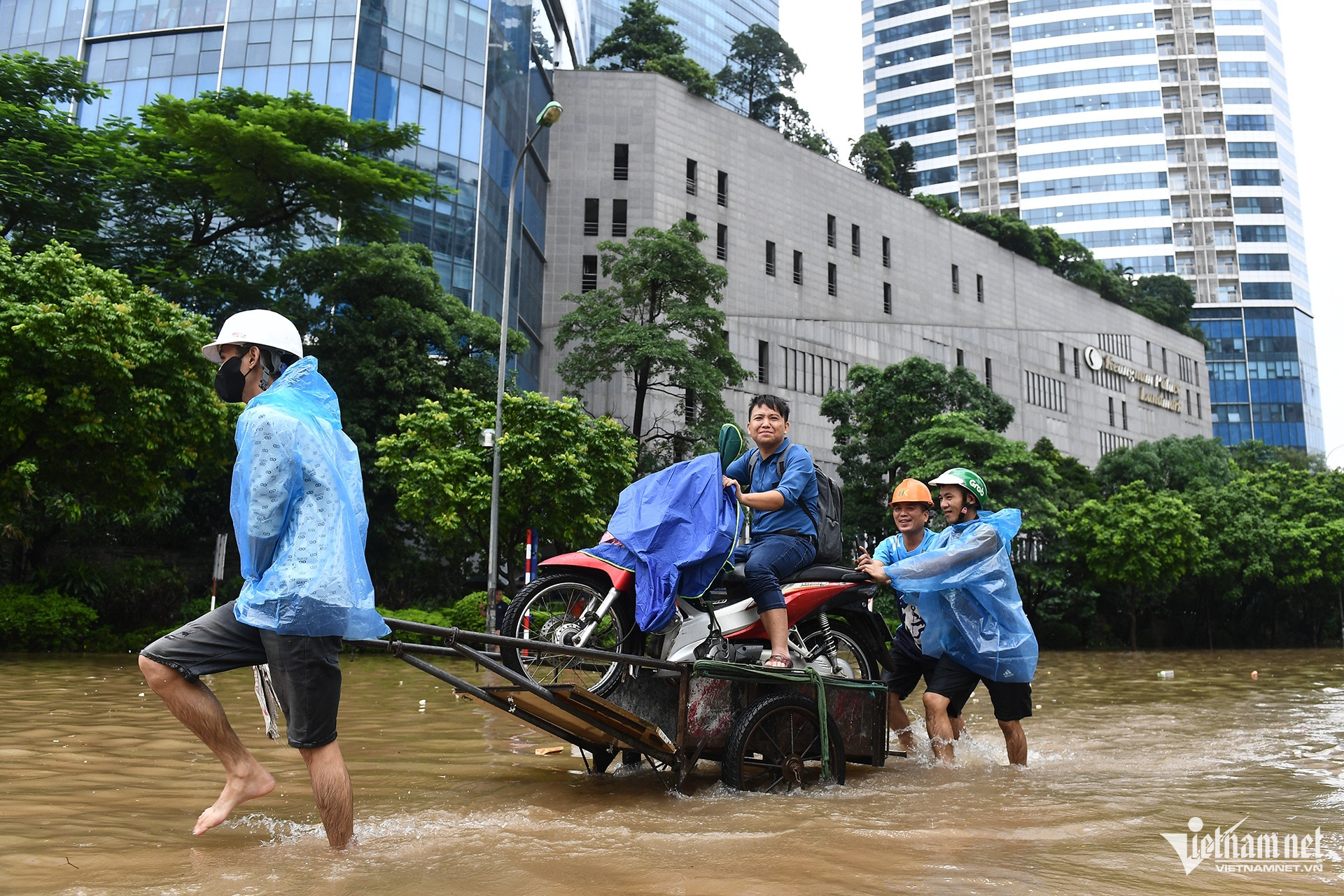 Để đi lại quanh khu vực tòa nhà Keangnam chỉ còn cách lội nước hoặc nhờ dịch vụ chở xe máy qua đoạn ngập.