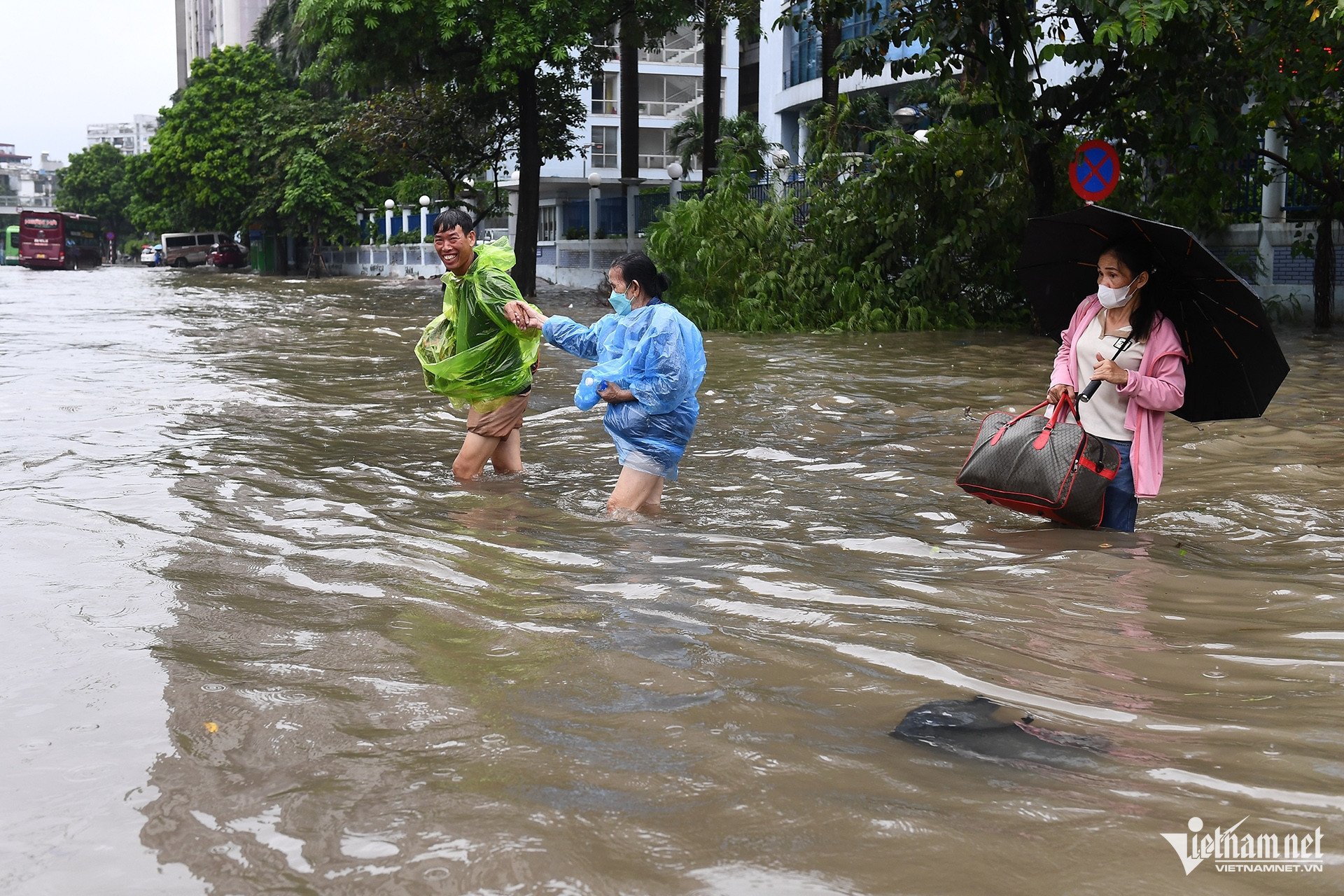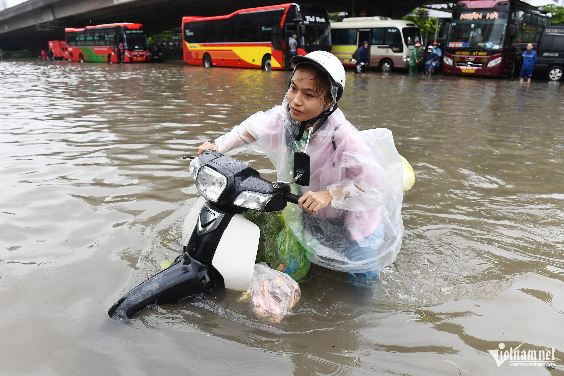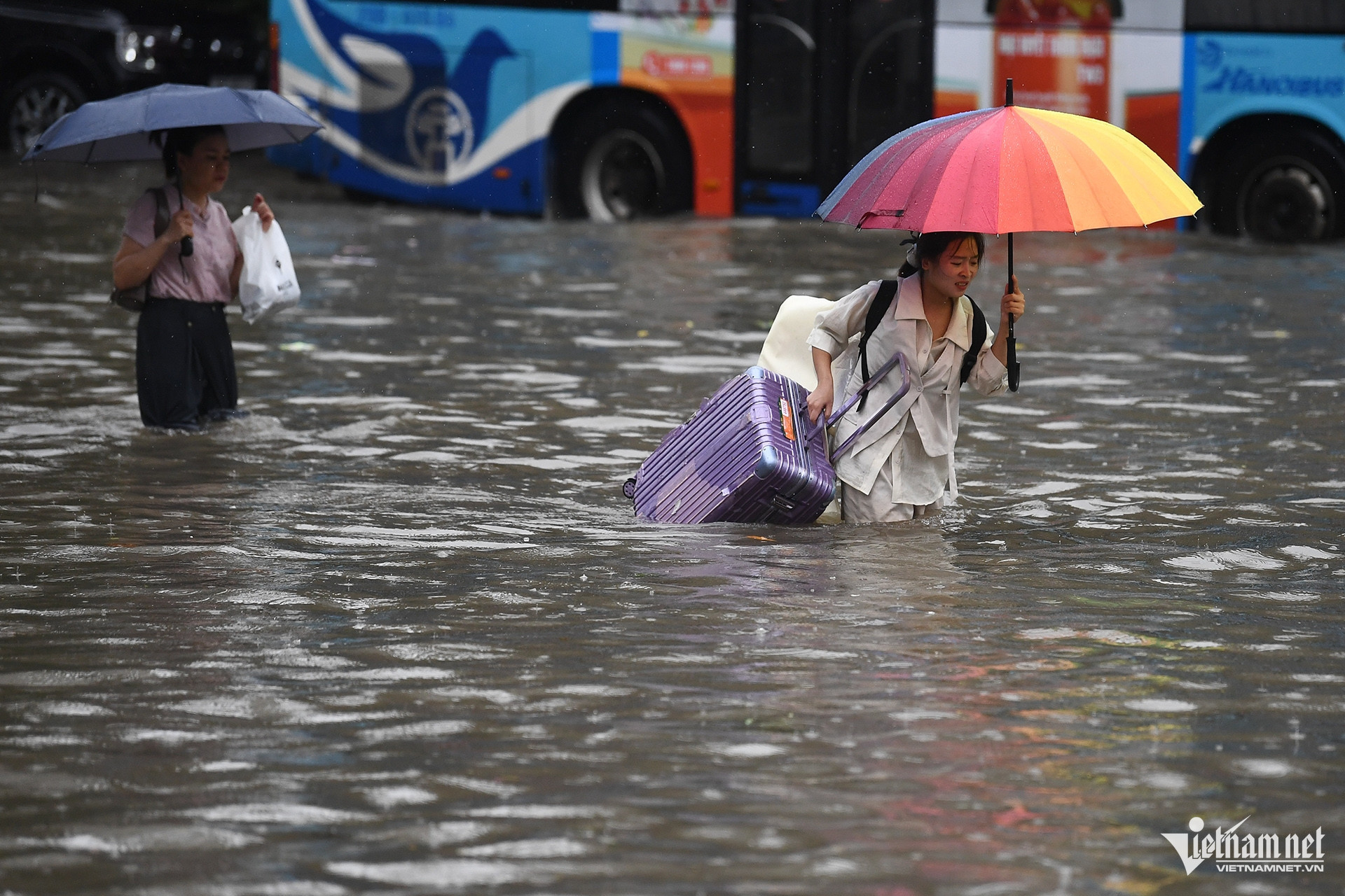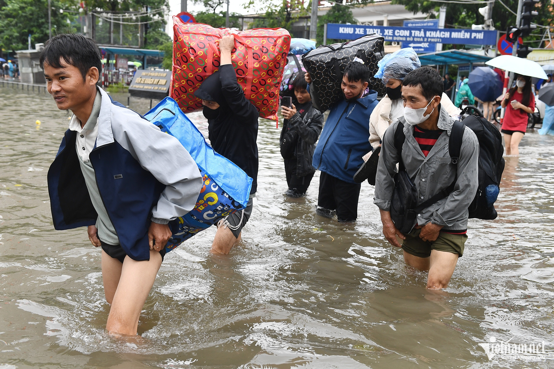 Sáng 7/10, tại khu vực bến xe Mỹ Đình, tòa nhà Keangnam và nhiều tuyến phố lân cận, hàng loạt tài xế và hành khách từ các tỉnh đến hoặc rời Hà Nội bị mắc kẹt, phải vật lộn trong dòng nước ngập sâu.