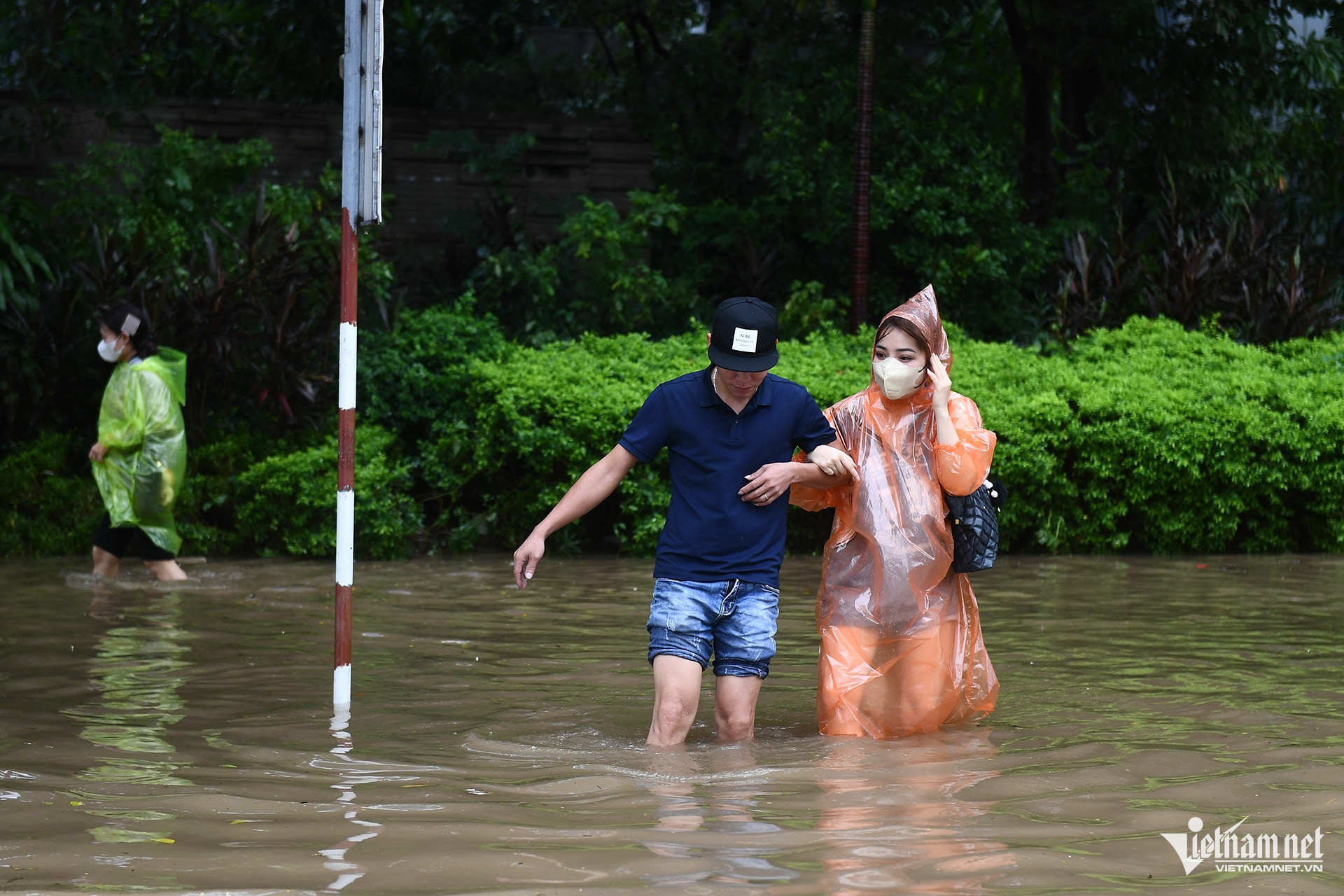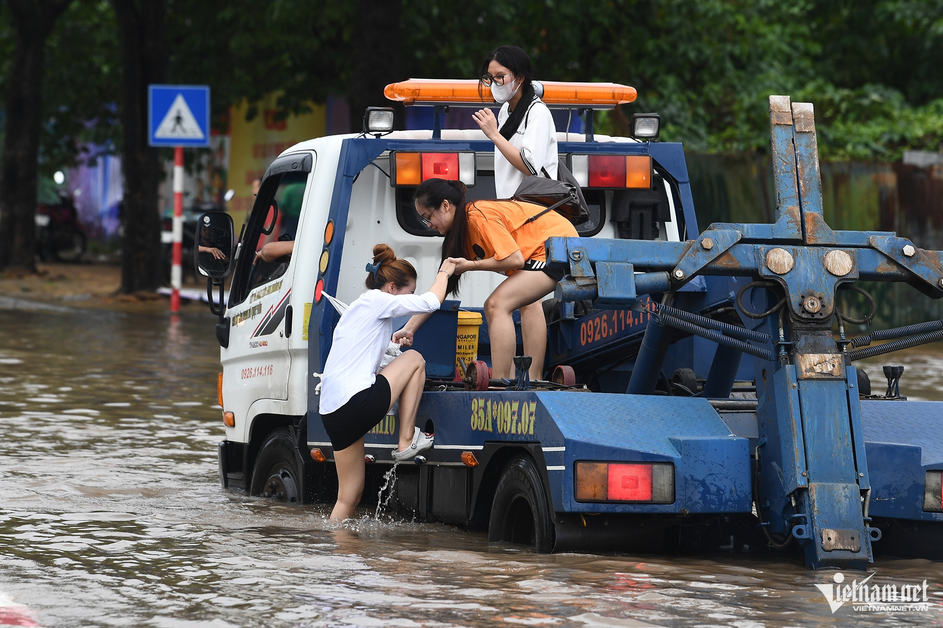 Ba cô gái đang lội nước ở gần Quảng trường Mỹ Đình liền được một xe cứu hộ cho đi nhờ qua đoạn ngập.