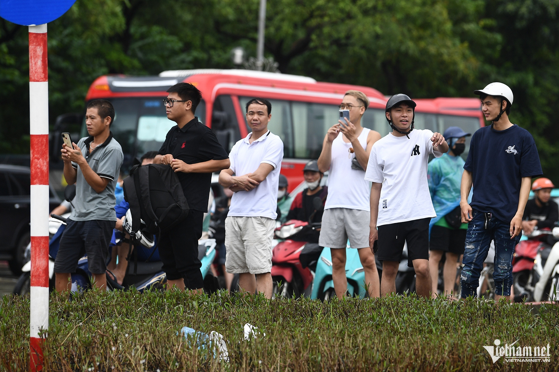 Tại bến xe Mỹ Đình - nơi người dân gọi vui là "cảng nước sâu" - hàng loạt xe buýt dừng lại một chỗ chờ nước rút. May mắn, lúc 10h khu vực các phường Từ Liêm, Cầu Giấy đã ngớt mưa.