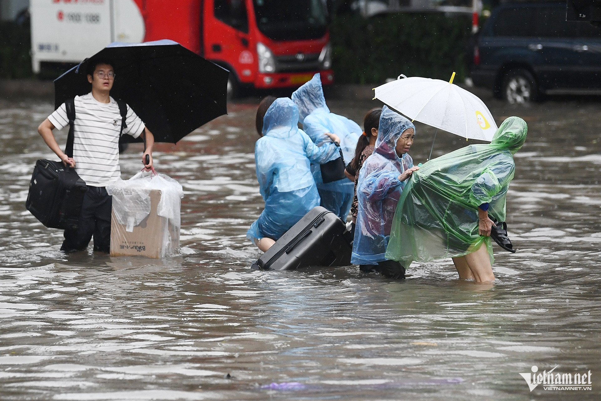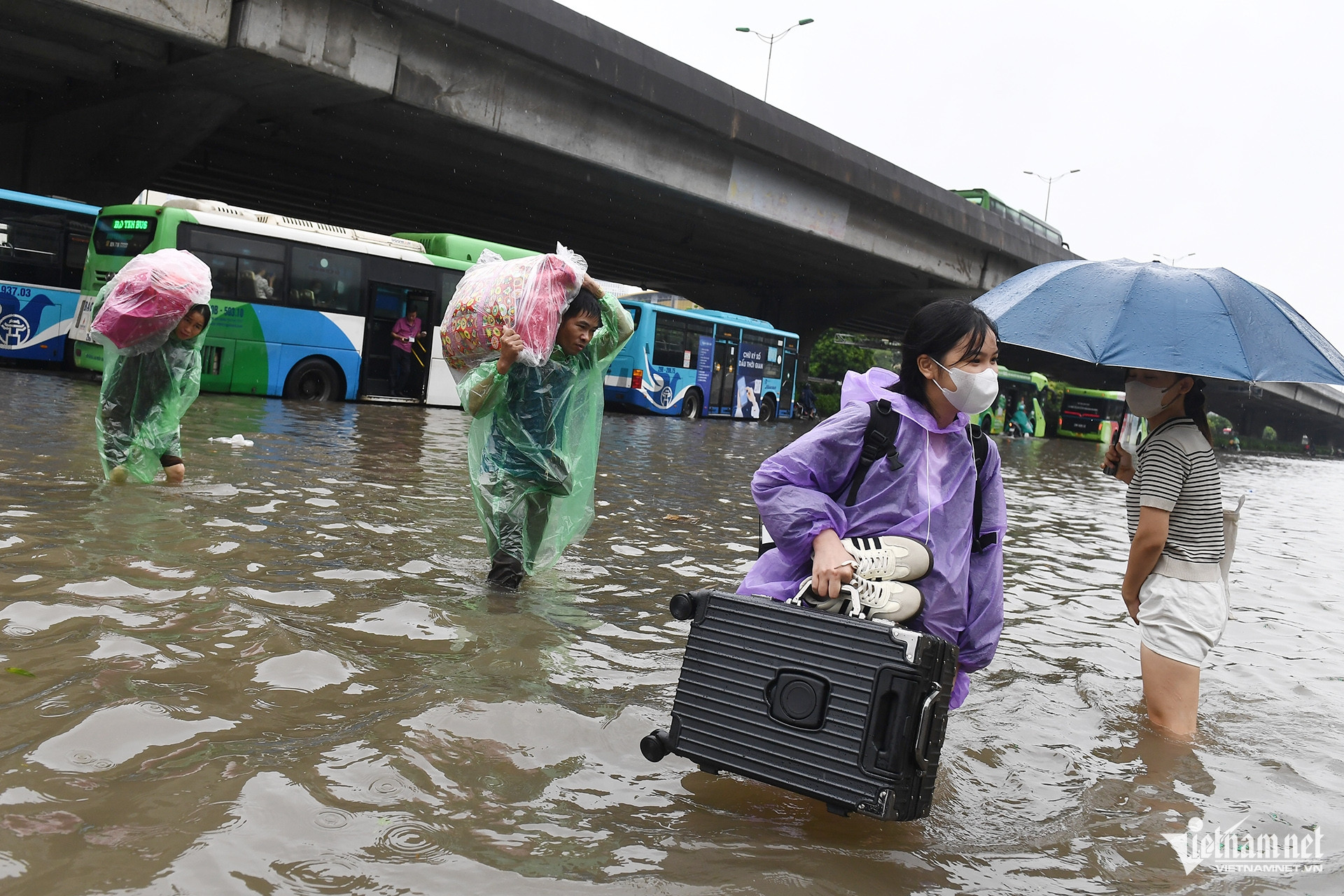 Nhóm hành khách tìm đường tới bến xe Mỹ Đình chật vật khi phải mang theo hành lý nặng đi bộ lội nước một đoạn dài.