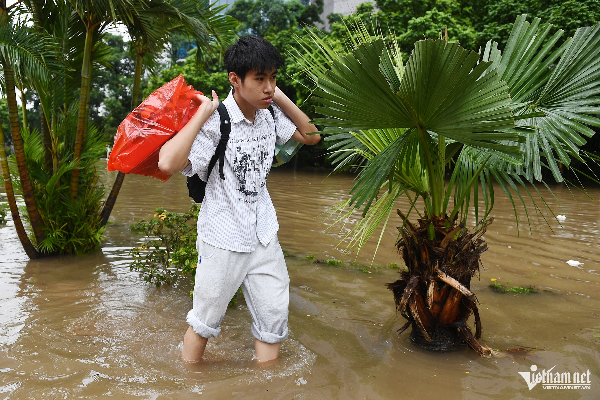 Phúc Khang cho biết, vừa từ Hải Phòng lên Hà Nội thì gặp mưa ngập. Cậu được xe ôm "thả" ở đầu đoạn ngập nên phải đi bộ vài km mới tới nhà.
