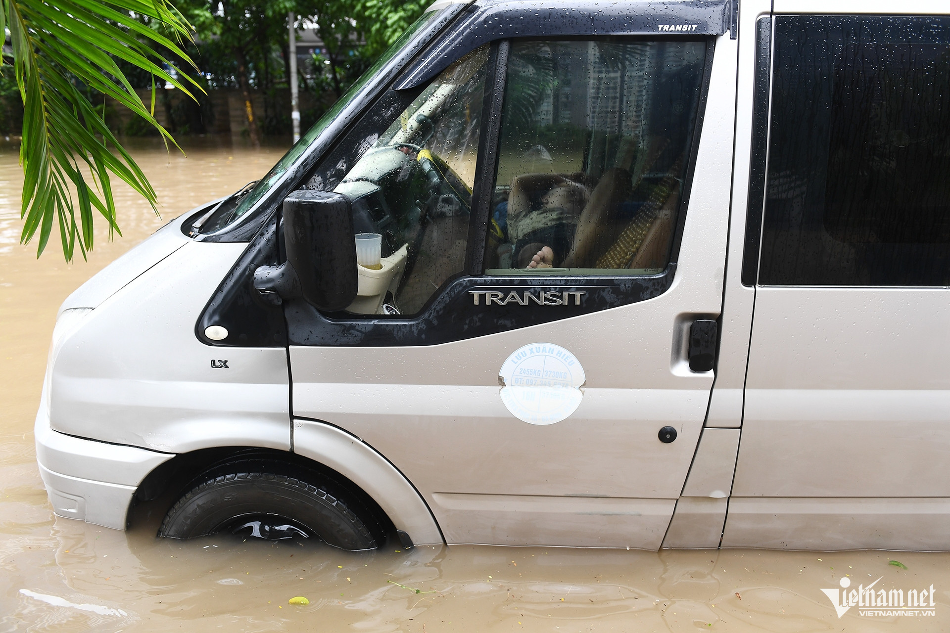 Một chiếc ô tô 16 chỗ đỗ giữa làn nước ngập trên phố Dương Đình Nghệ. Một người đàn ông nằm ngủ bên trong.