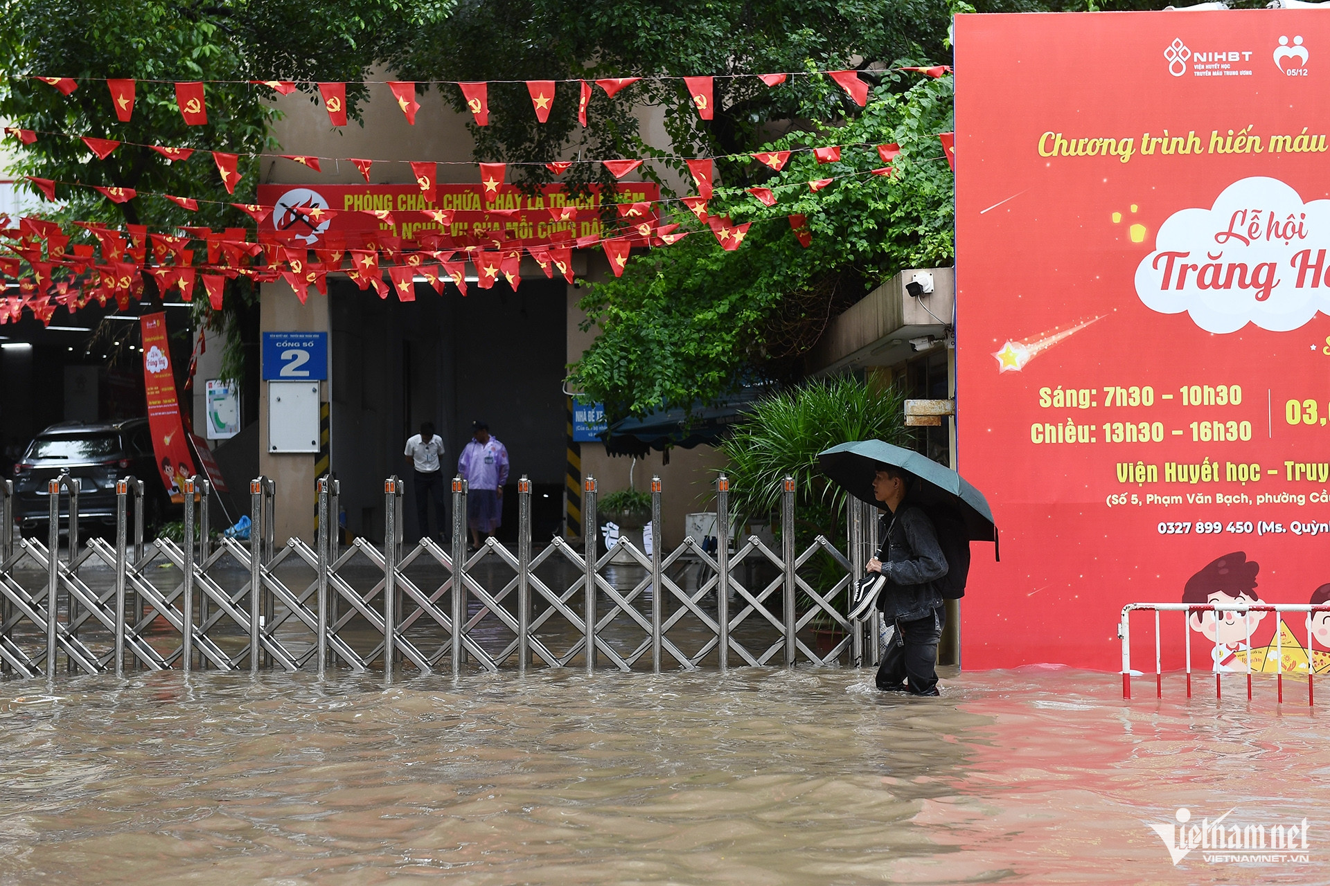 Gần như cứ đi vài trăm mét lại gặp một đoạn nước ngập, chỗ sâu nhất lên tới 1m. Hình ảnh trước cửa Viện Huyết học và Truyền máu Trung ương trên phố Phạm Văn Bạch.