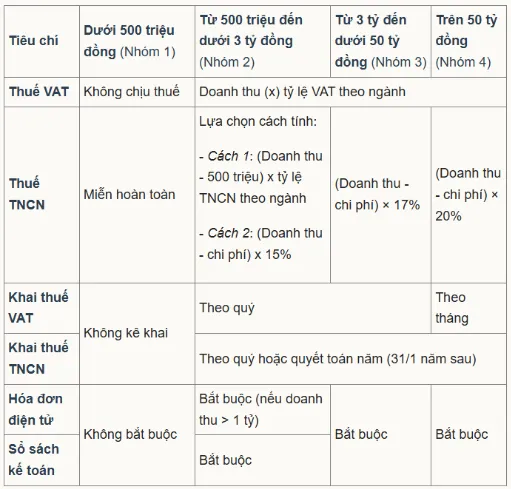 Bảng so sánh 4 nhóm hộ kinh doanh dự kiến được quản lý thuế từ 1/1/2026: