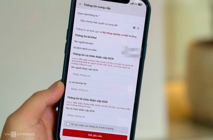 Các trường thông tin bắt buộc phải kê khai đó là số hiệu giấy chứng nhận, địa chỉ thửa đất trên sổ đỏ. Về file thông tin, người dân sẽ tải lên hình ảnh, tài liệu về sổ đỏ cần nộp dưới định dạng PDF, PNG, JPG. Cuối cùng, ấn vào xác nhận các thông tin trên là đúng và gửi yêu cầu. Các thông tin sẽ được gửi về Bộ Nông nghiệp và Môi trường.
