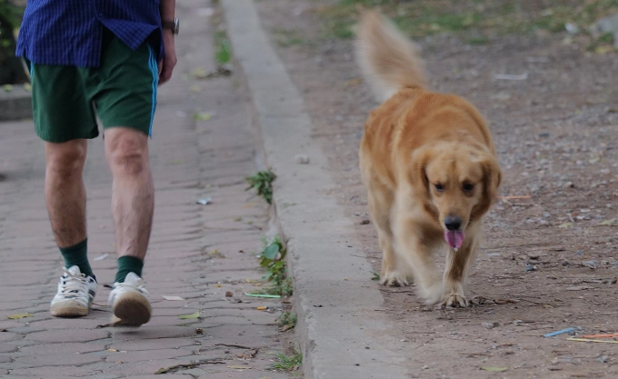 Người dân Hà Nội đưa chó ra ngoài không rọ mõm. Ảnh: Ngọc Thành