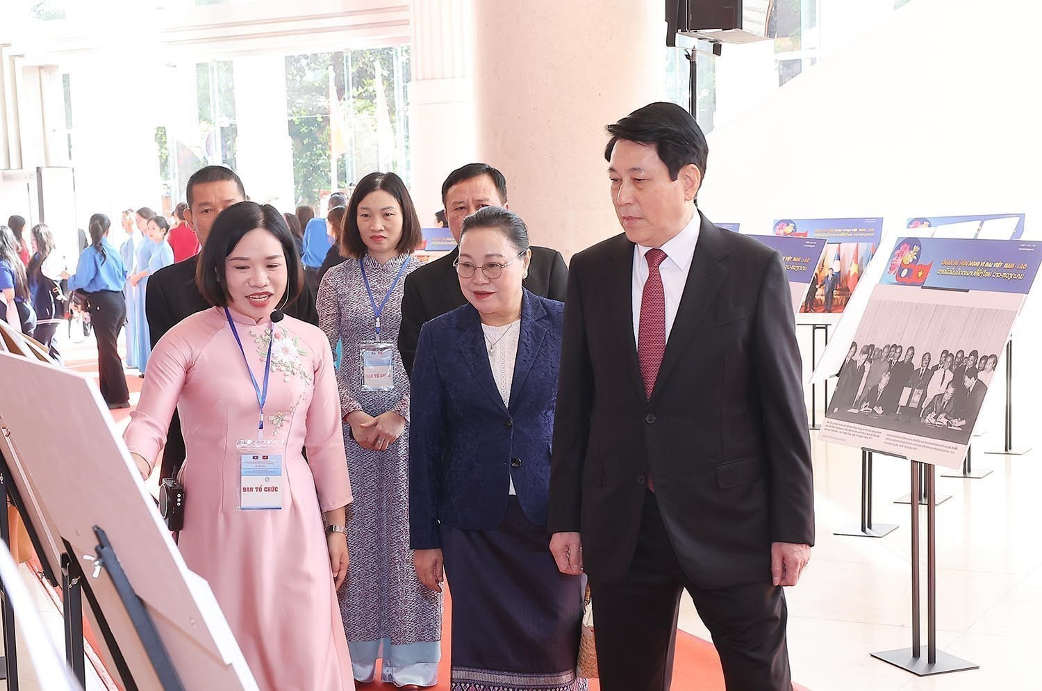 Chủ tịch nước Lương Cường cùng đại biểu tham quan trưng bày ảnh về quan hệ Việt Nam - Lào do Đại sứ quán Lào tại Việt Nam và Bộ Văn hóa, Thể thao và Du lịch Việt Nam phối hợp thực hiện. Ảnh: TTXVN