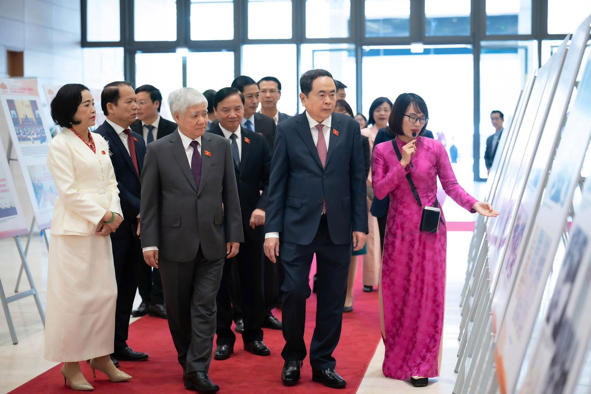 Chủ tịch Quốc hội Trần Thanh Mẫn và các đại biểu tham quan triển lãm "Quốc hội Việt Nam - quá trình xây dựng và hoàn thiện hệ thống pháp luật". Ảnh: Quốc hội
