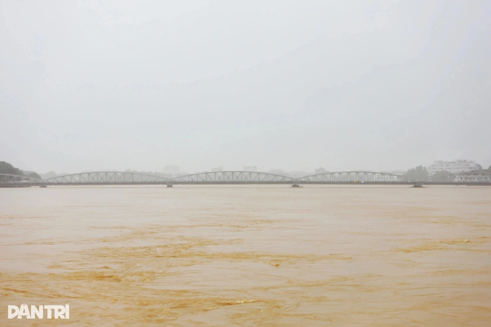 Nước lũ trên sông Hương vẫn cao hơn mức báo động 3, gần chạm gầm cầu Trường Tiền (Ảnh: Vi Thảo).