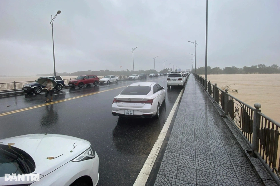 Người dân mang xe lên đậu trên cầu Phú Xuân (hay còn gọi là cầu Mới, bắc qua sông Hương) để tránh ngập lụt (Ảnh: Vi Thảo).