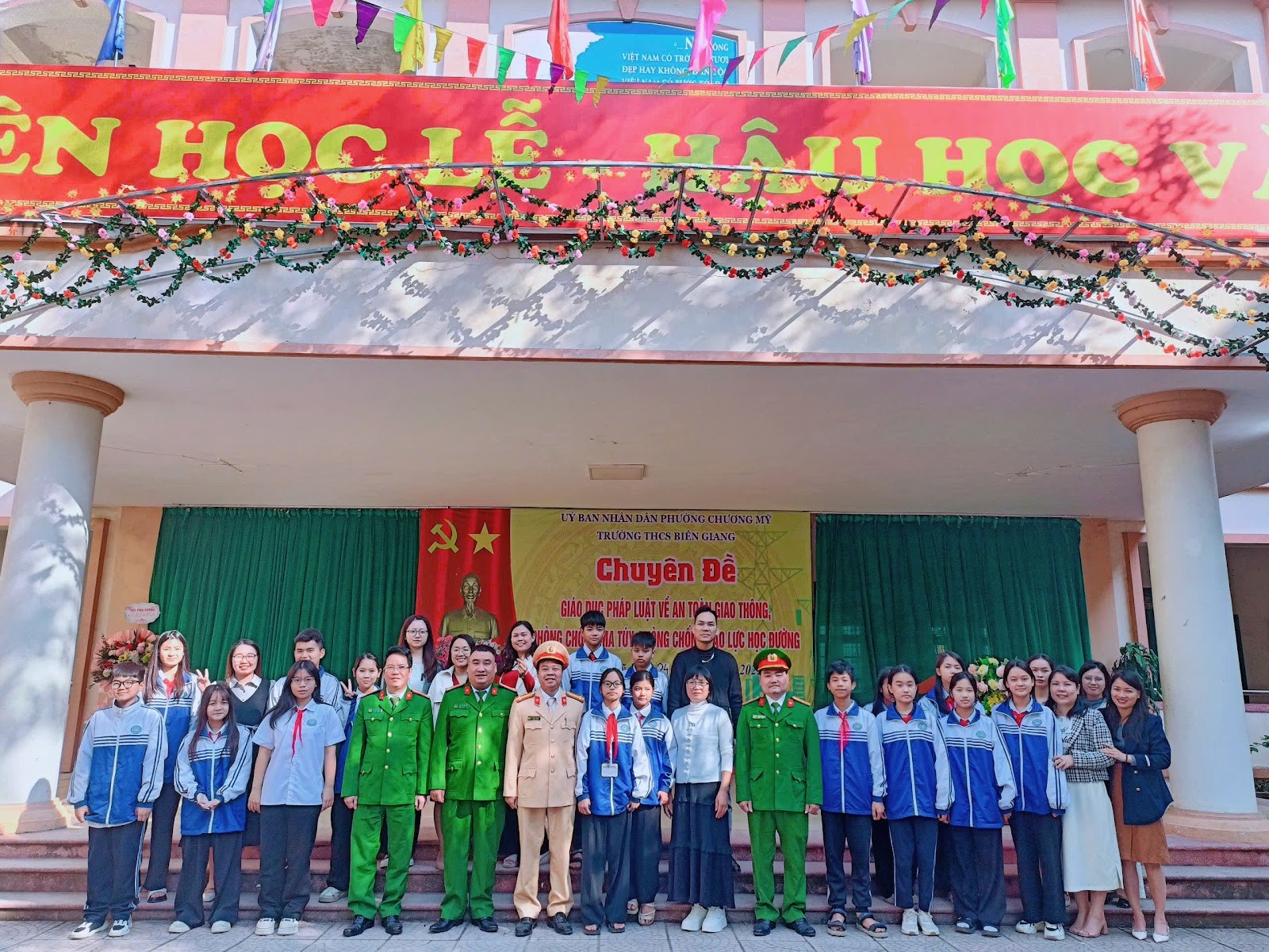 Dự buổi tuyên truyền có bà Nguyễn Thị Thu Hiền - Phó Hiệu trưởng trường THCS Biên Giang, trung tá Nguyễn Quang Việt - Phó Đội trưởng Đội CSGT đường bộ số 12, thiếu tá Hoàng Quốc Huy - cán bộ Công an phường Chương Mỹ cùng 693 học sinh và 36 cán bộ, giáo viên nhà trường.