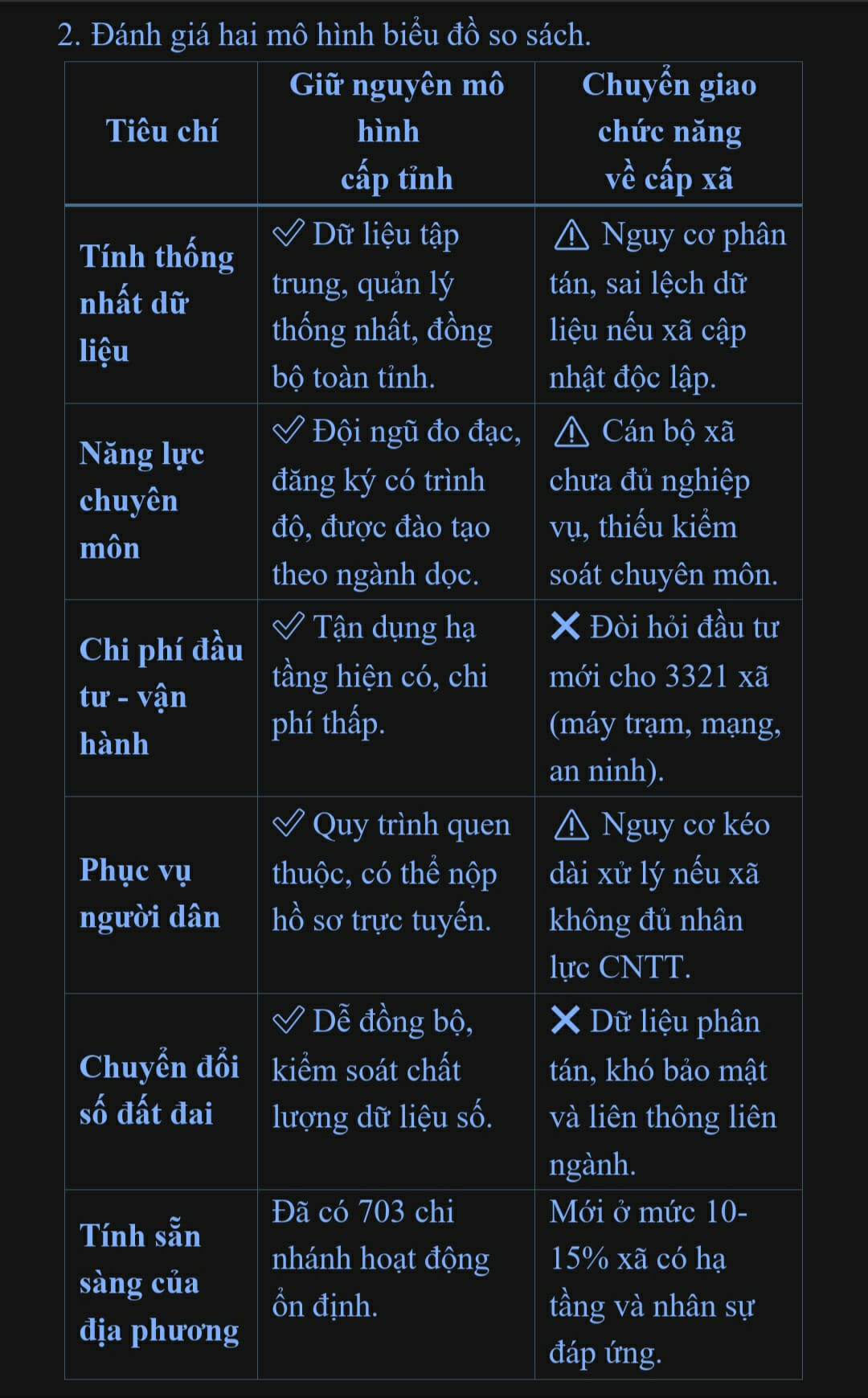 Hơn nữa, nếu giao toàn bộ việc này cho xã/phường, chi phí đầu tư hạ tầng cho 3.321 xã/phường sẽ vô cùng lớn. Bộ máy cấp xã sẽ phình to, trái tinh thần tinh gọn của Đảng. Ngược lại, mô hình 703 chi nhánh VPĐKĐĐ cấp tỉnh hiện nay đang hoạt động ổn định; giữ nguyên trong 3–5 năm nữa là phù hợp và an toàn.