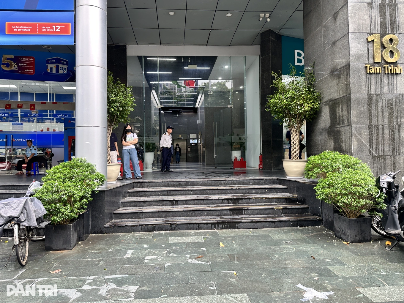 Ghi nhận của phóng viên Dân trí lúc 13h40 ngày 7/10, tại trụ sở công ty của ông Nguyễn Hòa Bình (còn gọi là Shark Bình), đặt tại tầng 3 tòa nhà số 18 Tam Trinh, có rất đông công an đang làm nhiệm vụ tại đây.