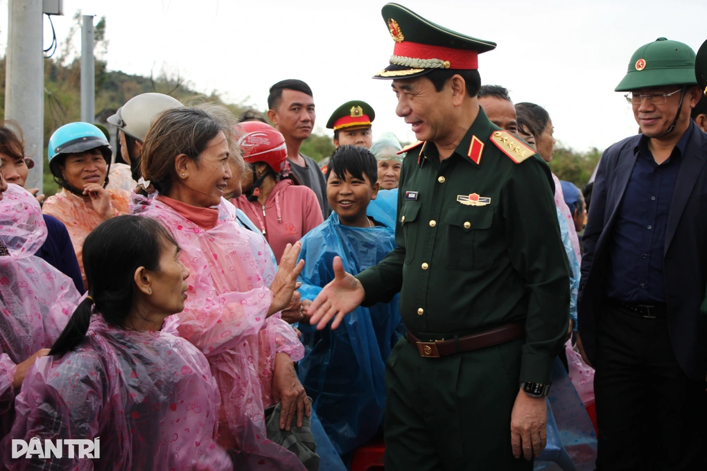Thay mặt lãnh đạo Đảng, Nhà nước, Quân ủy Trung ương và Bộ Quốc phòng, Đại tướng Phan Văn Giang đã ân cần thăm hỏi, chia sẻ với bà con vùng lũ, mong người dân sớm vượt qua khó khăn, ổn định cuộc sống.