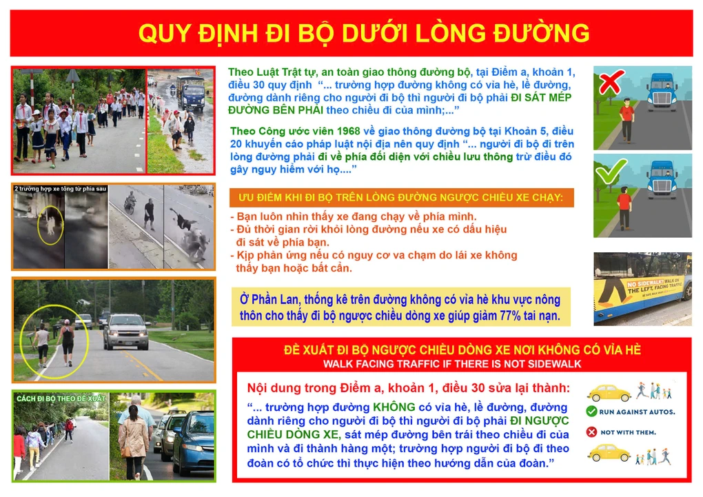 Ông dẫn khoản 5, Điều 20 của Công ước viên 1968 về giao thông đường bộ, trong đó nêu rõ pháp luật nội địa nên quy định người đi bộ đi trên lòng đường phải đi về phía đối diện với chiều lưu thông, trừ khi điều đó gây nguy hiểm với họ.