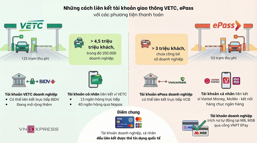 Từ đầu năm 2026, doanh nghiệp dùng VETC, ePass có thể liên kết tài khoản giao thông với ngân hàng BIDV, Vietcombank để trả phí không dừng ETC.