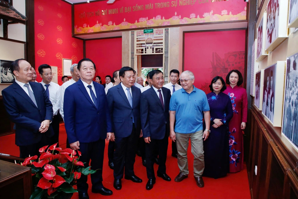 Lãnh đạo Trung ương và TP Hà Nội tham quan, nghe thuyết minh về triển lãm tại di tích lưu niệm 48 Hàng Ngang (Ảnh: Viết Thành).