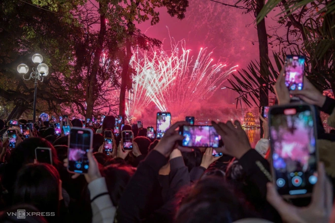 Người dân dùng điện thoại ghi lại khoảnh khắc bắn pháo hoa chào mừng Tết Dương lịch 2026 tại Hồ Gươm. Ảnh: Giang Huy