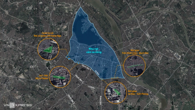 Vị trí 4 trạm sạc theo đề xuất của Công ty Khai thác điểm đỗ xe Hà Nội. Đồ họa: Đỗ Nam