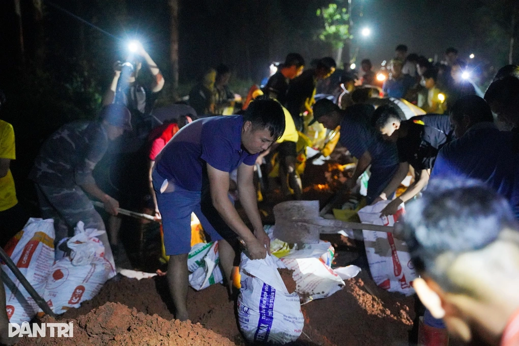 Hàng trăm người dân cùng lực lượng chức năng xã Mỹ Thái, tỉnh Bắc Ninh thức trắng đêm 9/10, hối hả xúc đất, đóng bao tải, gia cố từng mét đê khi dòng lũ dữ đang lên nhanh (Ảnh: Minh Nhật).