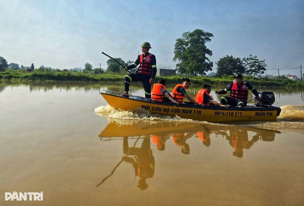 Lực lượng cứu hộ cứu nạn đưa người dân ở các xã thuộc huyện Sóc Sơn (cũ), Hà Nội ra khỏi khu vực bị cô lập (Ảnh: Bạch Huy Thanh).