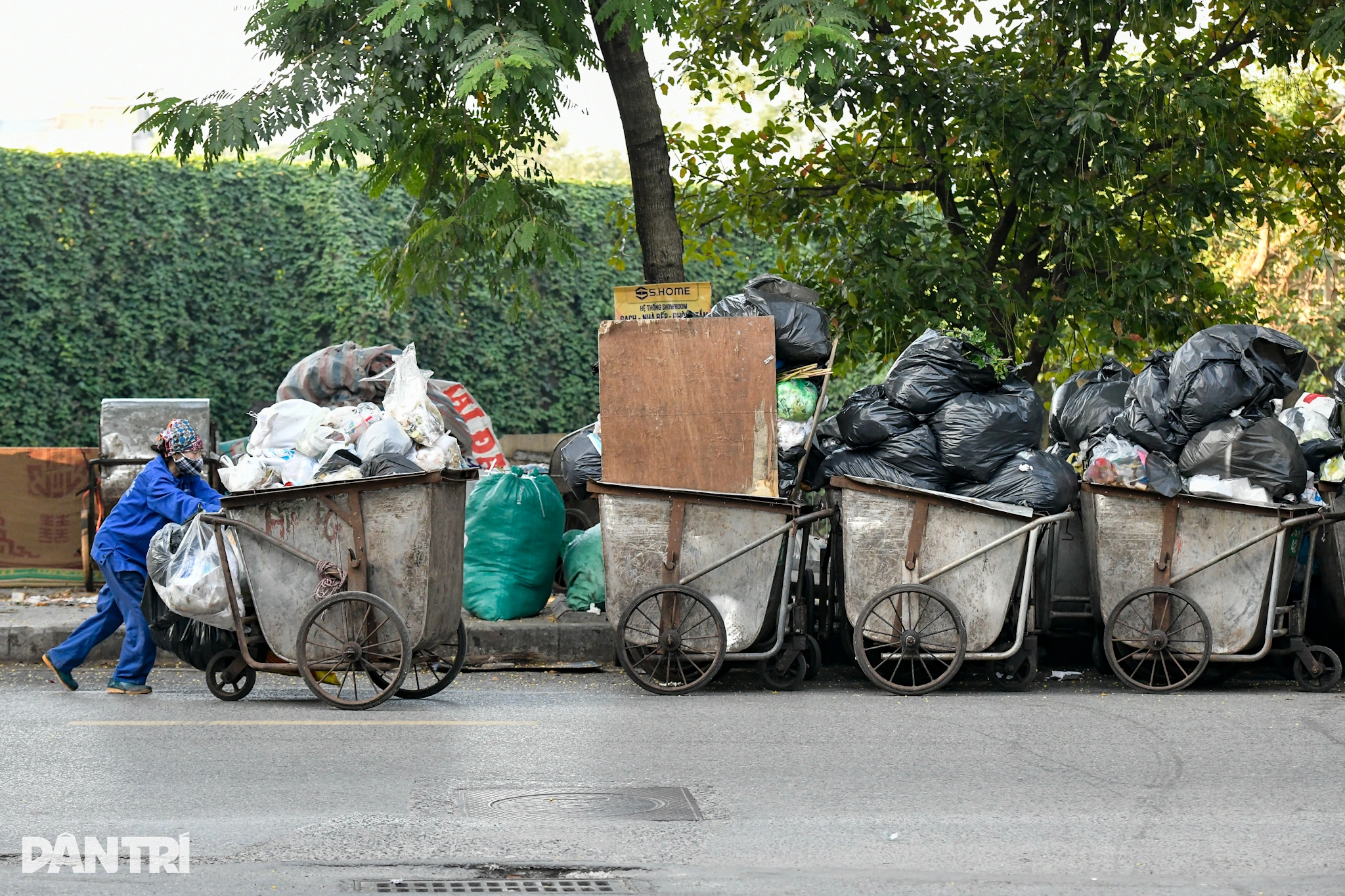 Sau giờ thu gom, các xe rác được đưa về các điểm tập kết dưới lòng đường (Ảnh: Sơn Nguyễn).
