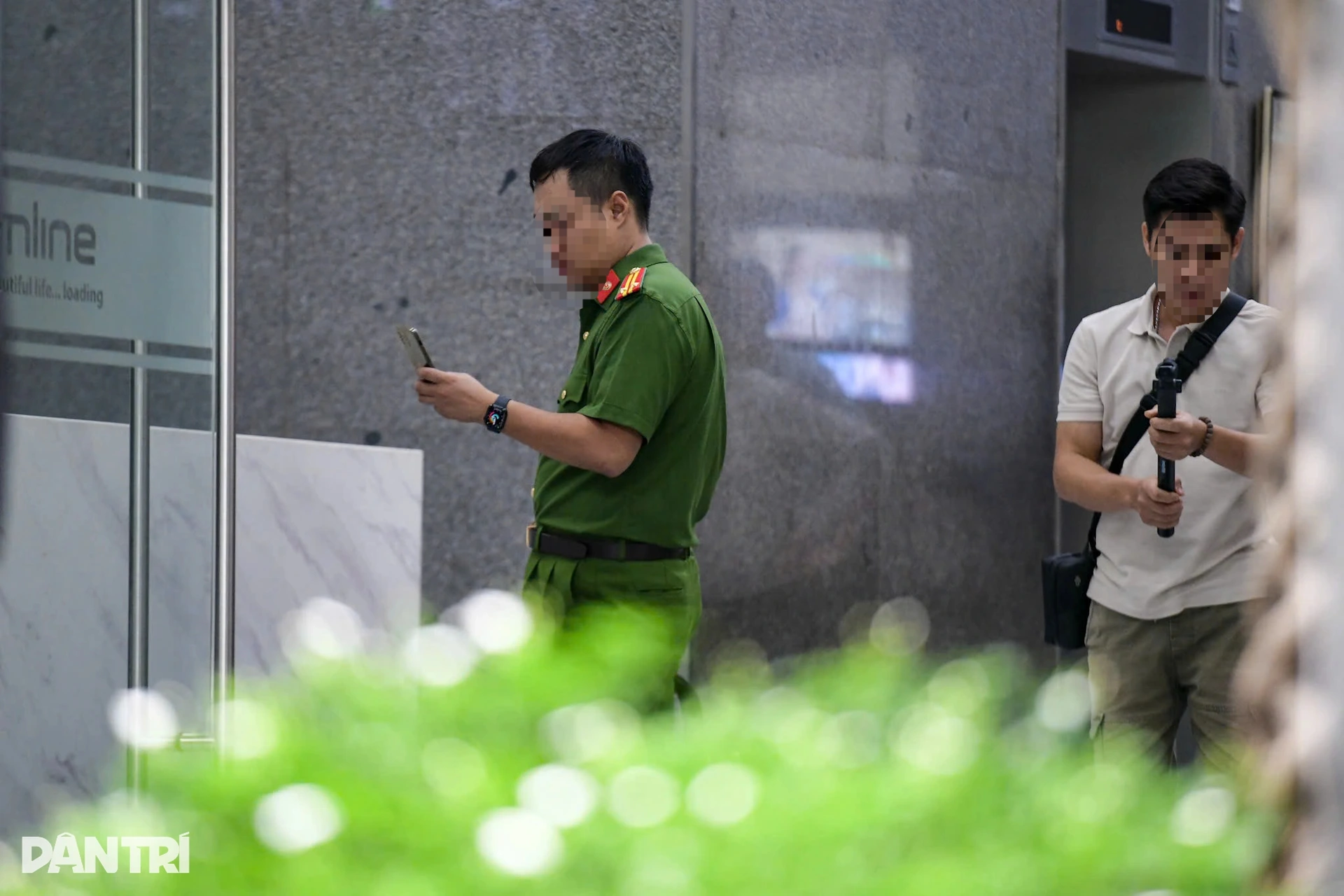 Theo ghi nhận của phóng viên Dân trí trong chiều 7/10, có rất đông công an làm nhiệm vụ tại tòa nhà 18 Tam Trinh, Hà Nội - nơi đặt trụ sở công ty của doanh nhân Nguyễn Hòa Bình (thường gọi là Shark Bình).