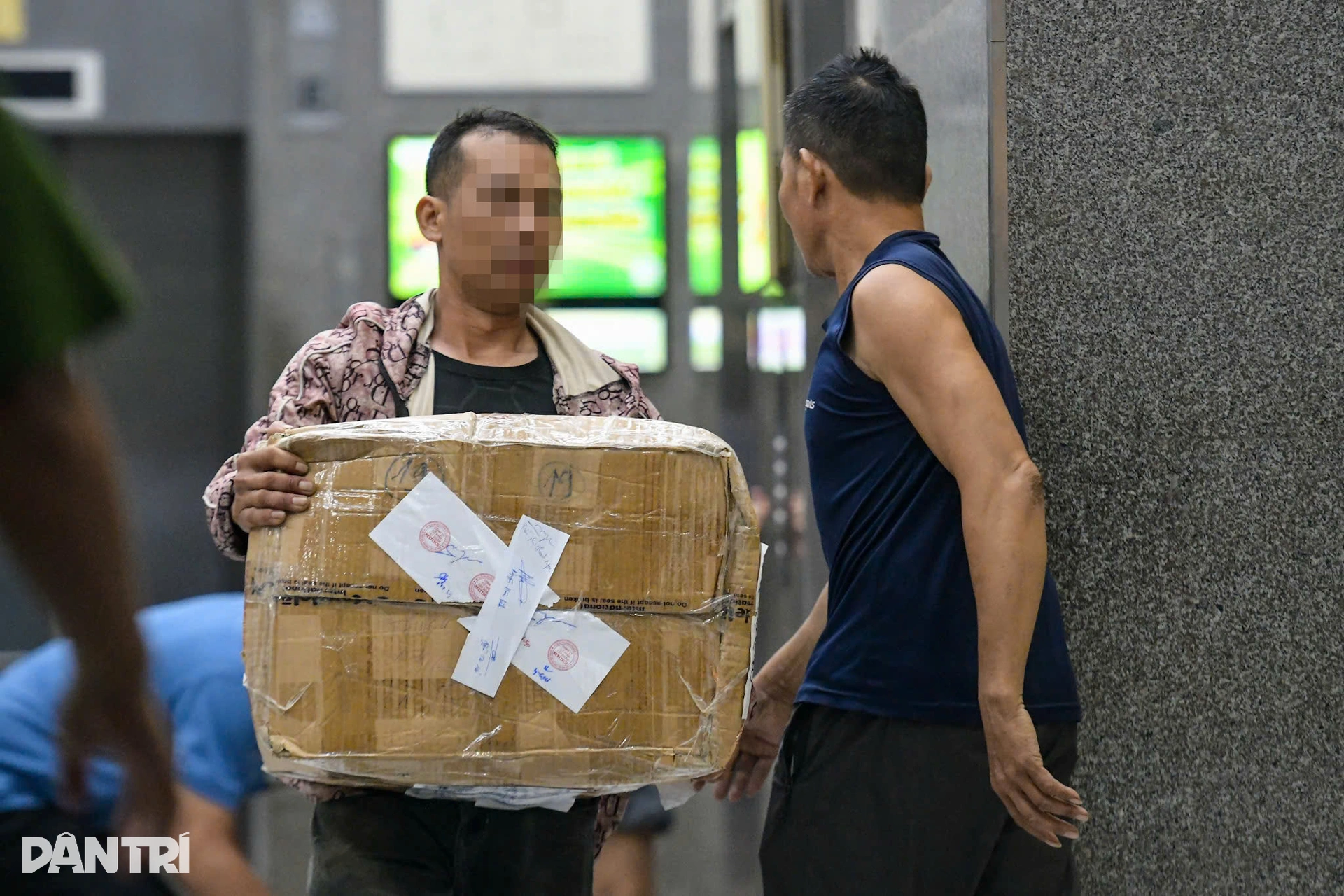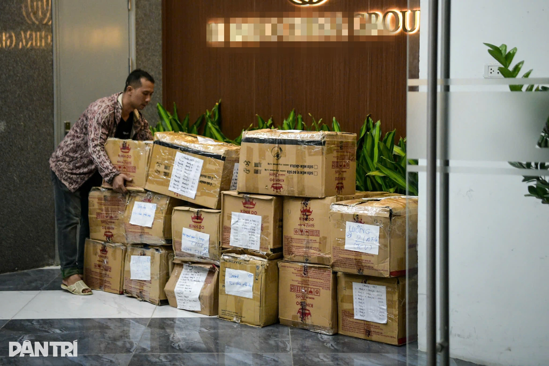 Đến tối 7/10, dưới sự giám sát của công an, một số người đưa hàng chục thùng giấy chứa tài liệu xuống sảnh tầng 1 tòa nhà 18 Tam Trinh.
