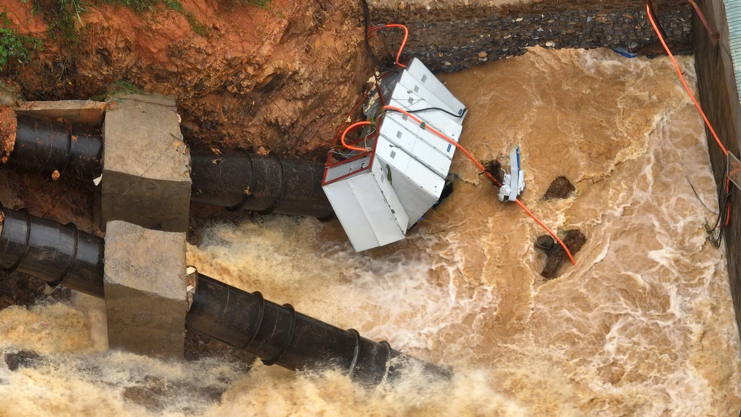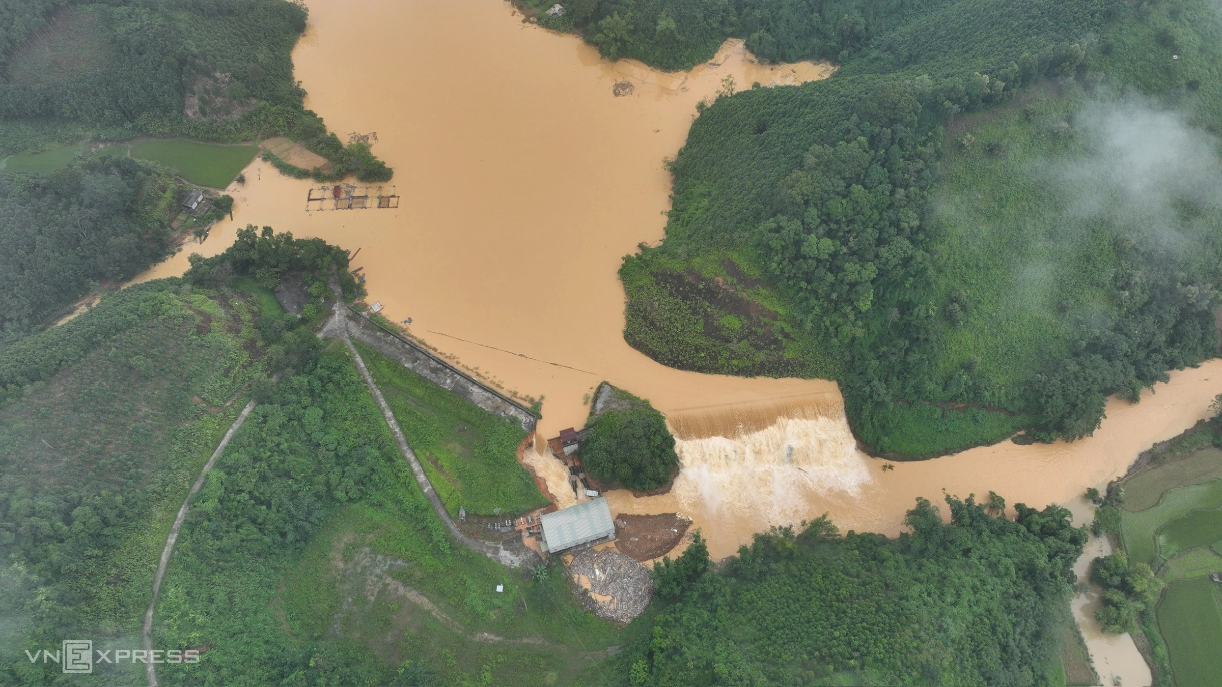Một ngày sau khi đập thủy điện Bắc Khê 1 bị vỡ, nước vẫn tràn qua, chảy xuống hạ nguồn theo một con suối. Mực nước hồ đã rút hơn một mét so với hôm qua.