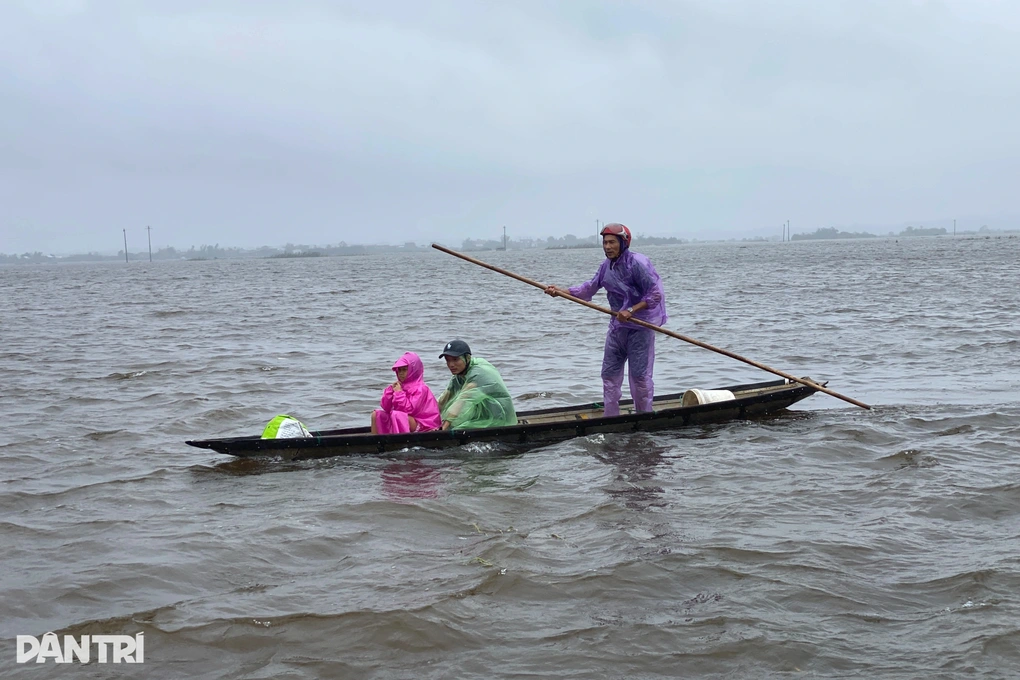 Nhiều làng quê thấp trũng tại thành phố Huế bị cô lập vì nước lũ dâng cao, người dân đi lại bằng thuyền nan (Ảnh: Vi Thảo).