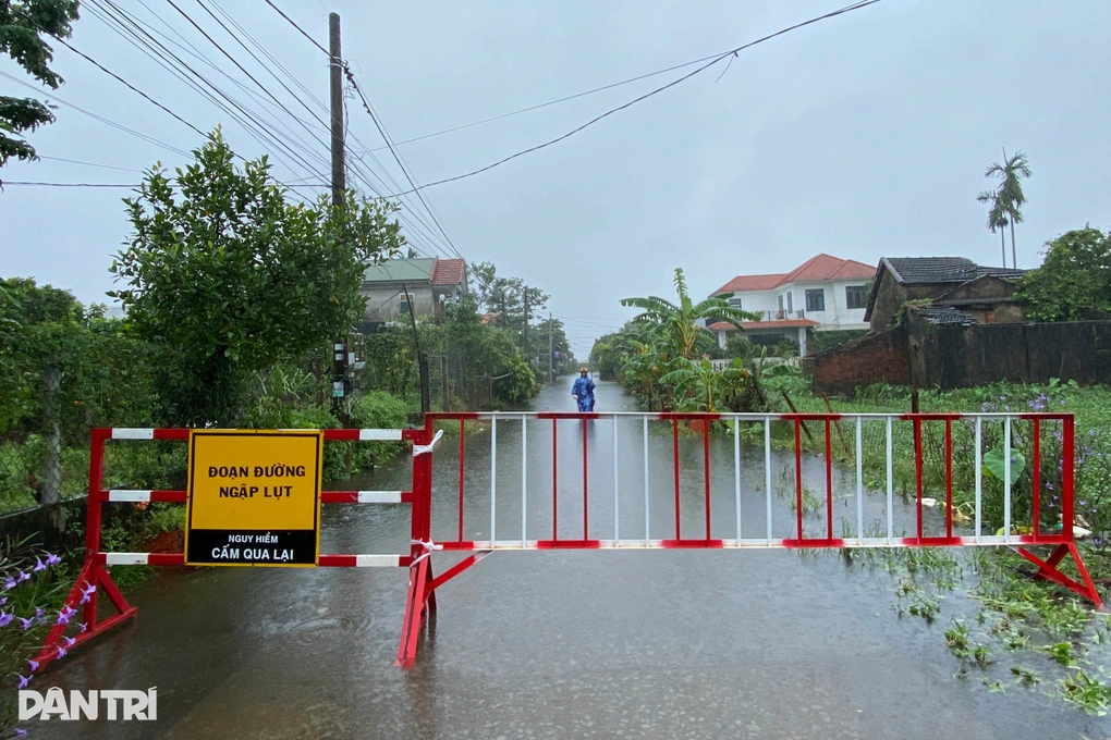 Cùng ngày, theo ghi nhận của phóng viên Dân trí tại xã Quảng Điền, nhiều tuyến đường cũng ngập sâu, buộc chính quyền phải rào chắn, cấm người dân đi qua.