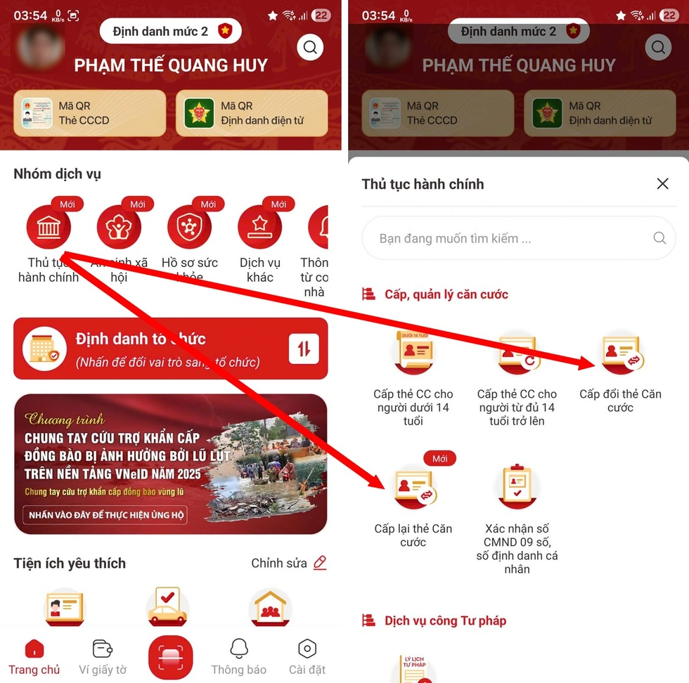 - Từ giao diện chính của ứng dụng, bạn chọn “Thủ tục hành chính”, sau đó tìm đến mục “Cấp, quản lý căn cước” và nhấn vào một trong những chức năng cần thực hiện.