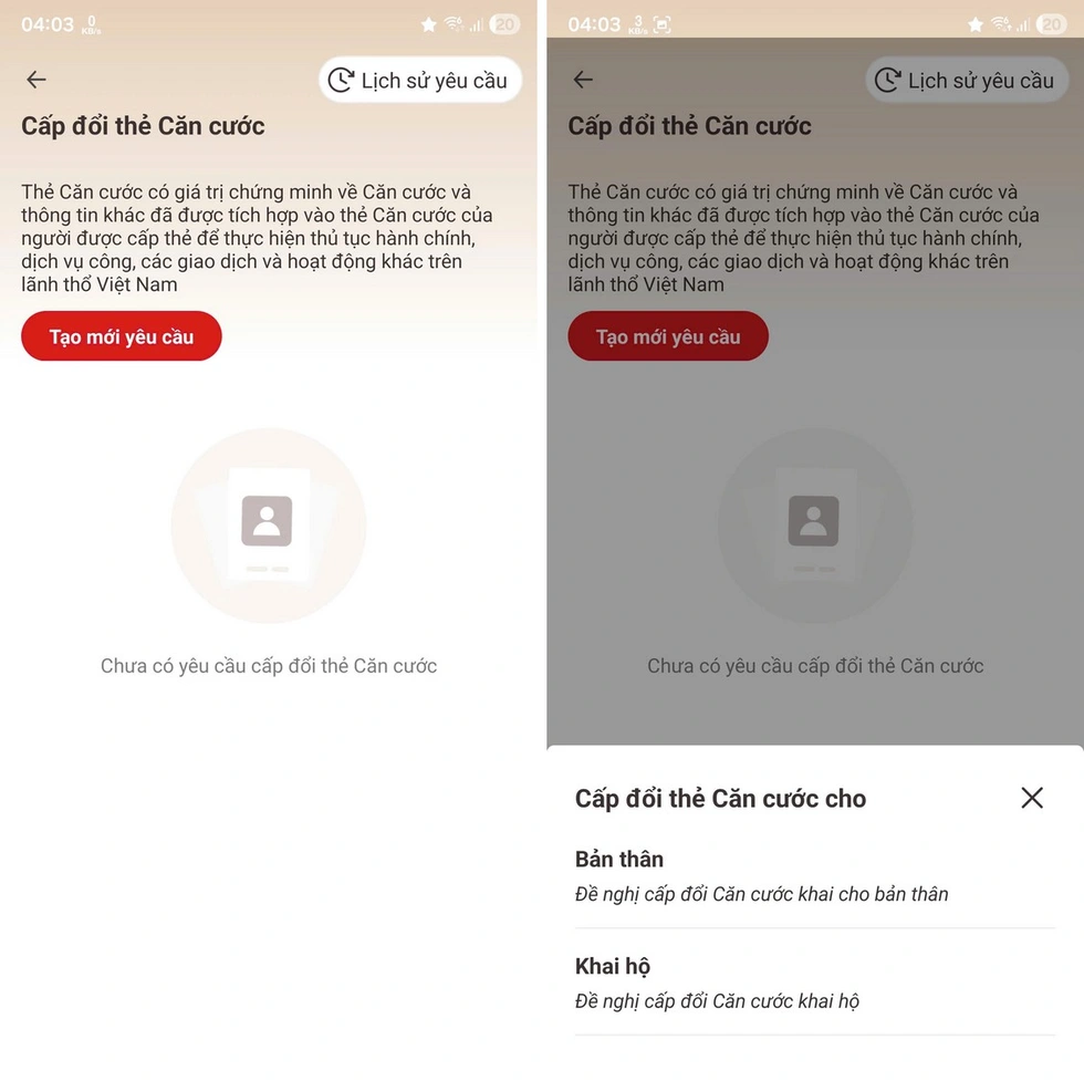 Lưu ý: Bạn chỉ được yêu cầu cấp lại thẻ Căn cước trong trường hợp đã đổi từ thẻ Căn cước Công dân cũ sang thẻ Căn cước kiểu mới. Trong trường hợp chưa từng được cấp thẻ Căn cước, bạn không thể thực hiện yêu cầu này.