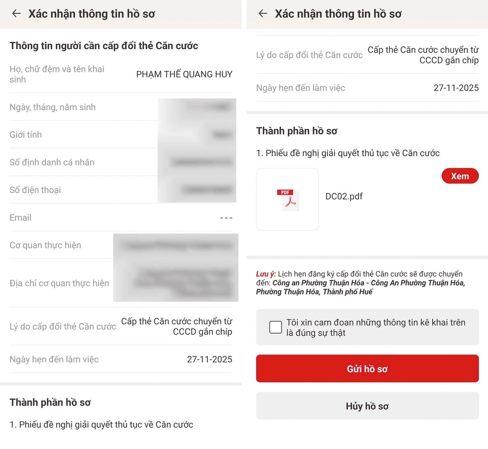 - Cuối cùng, VNeID sẽ cho người dùng kiểm tra lại thông tin đã khai báo, mẫu đơn sẽ được gửi đến cơ quan công an để yêu cầu cấp đổi thẻ Căn cước. Nếu những thông tin là chính xác, đánh dấu vào tùy chọn “Tôi xin cam đoan những thông tin kê khai trên là đúng sự thật”, sau đó nhấn nút “Gửi hồ sơ”.