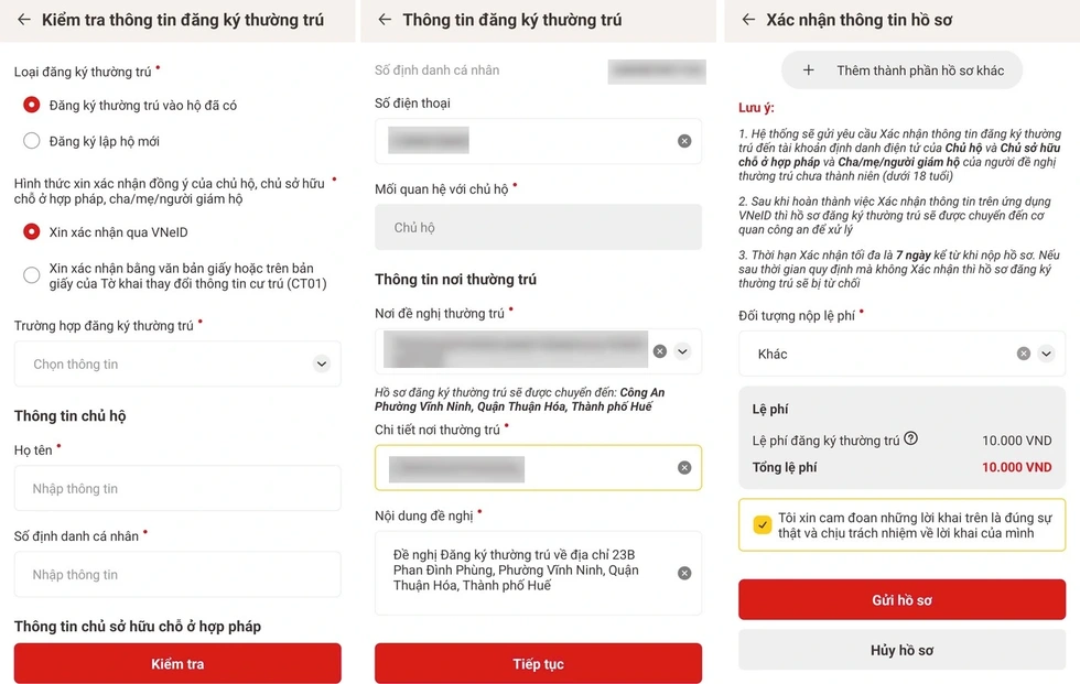 Tiếp theo, người dùng khai báo thông tin về nơi thường trú/tạm trú, sau đó nhấn nút "Tiếp tục”.