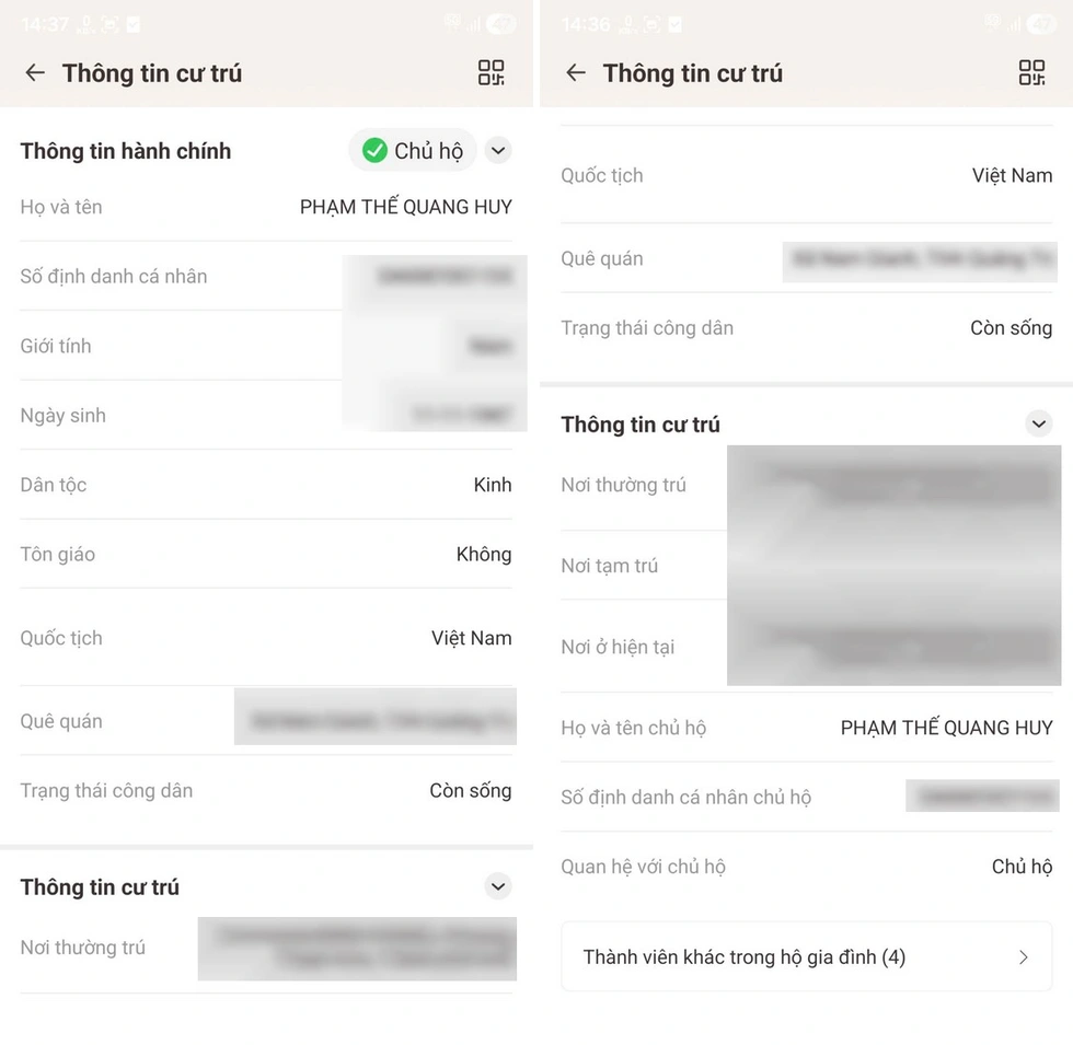 - Sau khi nhập mật khẩu, thông tin cư trú của bạn sẽ được hiển thị, bao gồm nơi ở hiện tại, địa chỉ thường trú, tên chủ hộ, quan hệ với chủ hộ… Bạn cũng có thể nhấn vào mục “Thành viên khác trong hộ gia đình” để xem thông tin về những người khác trong gia đình của bạn.