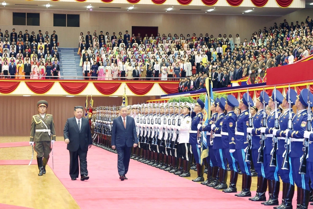 Lễ đón Tổng Bí thư Tô Lâm thăm cấp Nhà nước tới CHDCND Triều Tiên (Ảnh: Thống Nhất - TTXVN).