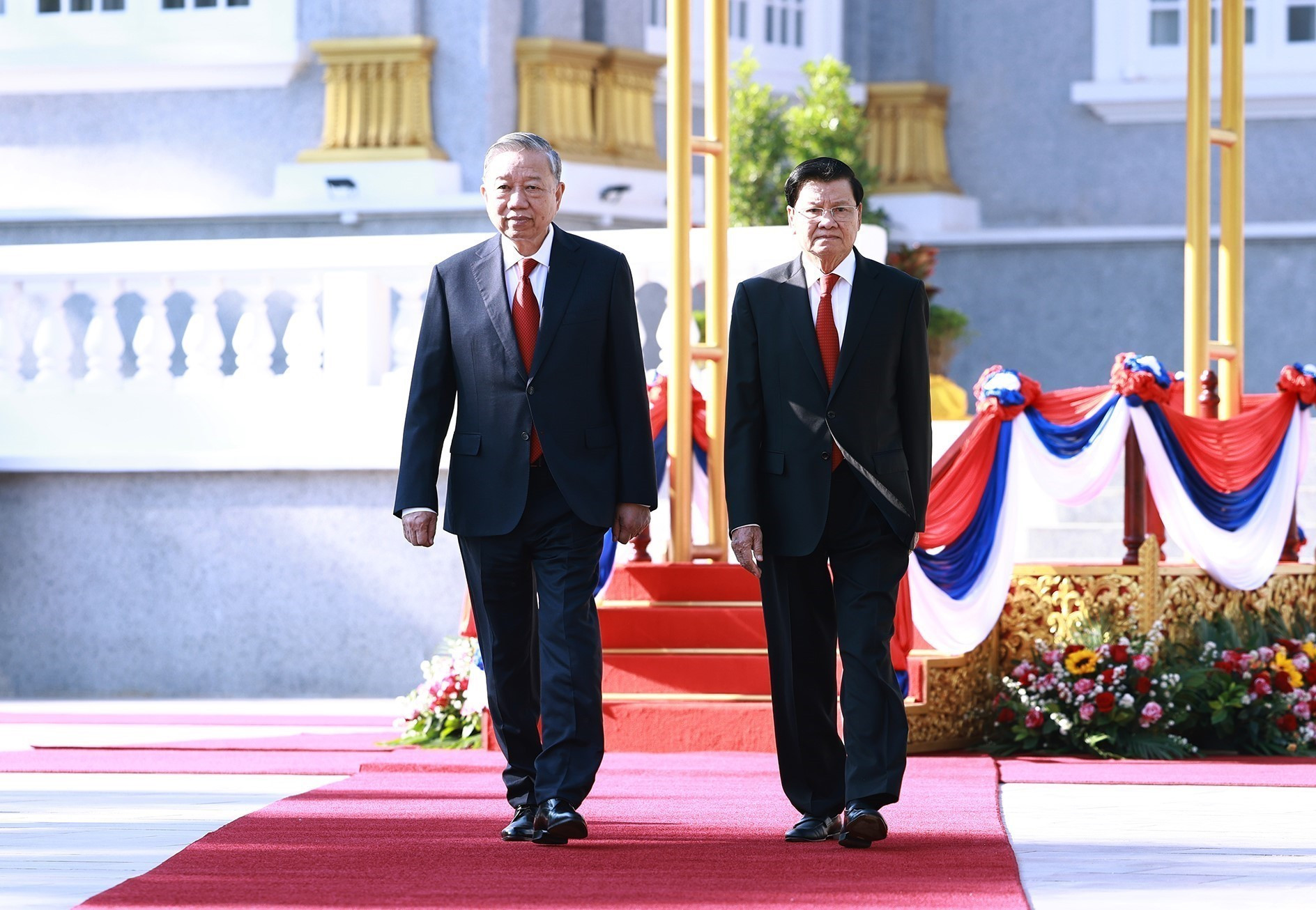 Sau khi nhận bó hoa tươi thắm từ các em thiếu nhi tặng, Tổng Bí thư Tô Lâm được Tổng Bí thư, Chủ tịch nước Lào Thongloun Sisoulith mời lên bục danh dự. Quân nhạc cử quốc thiều Việt Nam và Lào vang lên trang trọng. Tổng Bí thư, Chủ tịch nước Lào Thongloun Sisoulith mời Tổng Bí thư Tô Lâm duyệt đội danh dự.