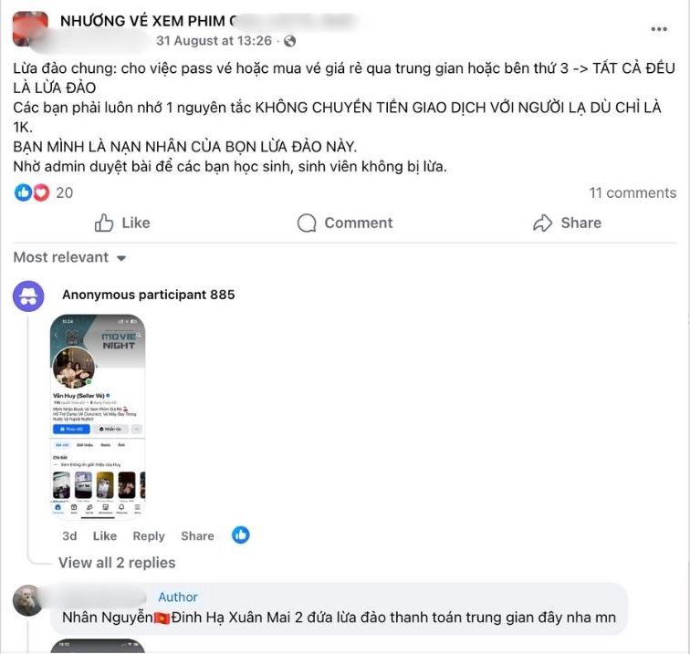 Bạn N.L.N.H (Cầu Giấy, Hà Nội) với mong muốn trực tiếp xem "Mưa đỏ" đã rơi vào "bẫy" mua vé ảo 2 lần. H chia sẻ: "Mình định mua vé trực tiếp nhưng khung giờ mình muốn xem đã hết vé. Khi thấy trên các hội nhóm có rao bán vé nên mình đã hỏi mua và chuyển khoản trước cho người bán".