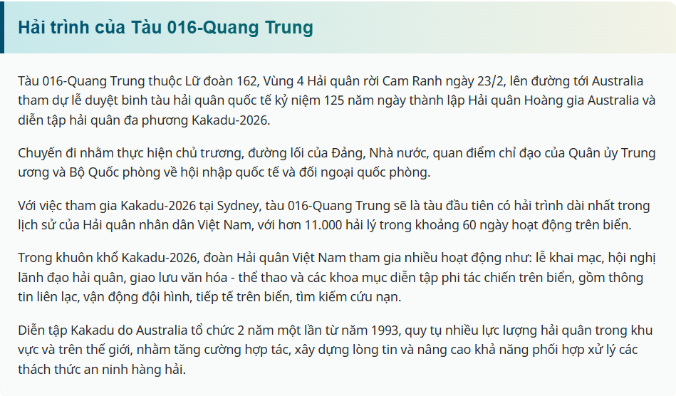Tàu 016-Quang Trung thuộc Lữ đoàn 162, Vùng 4 chở đoàn công tác Hải quân nhân dân Việt Nam do Đại tá Nguyễn Minh Lành, Phó tham mưu trưởng Vùng 4 làm trưởng đoàn đã cập cảng Căn cứ Hải quân Coonawarra ở thành phố Darwin, lãnh thổ Bắc Australia chiều tối qua. Tàu làm công tác hậu cần, kỹ thuật để chuẩn bị cho hải trình đến Sydney.