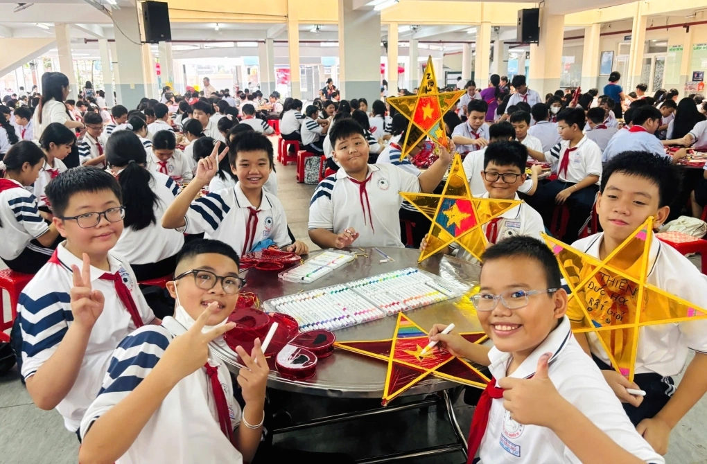 Học sinh lớp 6, 7 trường THCS Nguyễn Du tự làm lồng đèn Trung thu trong hoạt động trải nghiệm, ngày 30/9. Ảnh: THCS Nguyễn Du