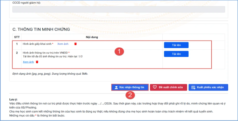Trong trường hợp thông tin hồ sơ tuyển sinh chính xác, phụ huynh tải lên hình ảnh giấy khai sinh và thông tin cư trú trên VneID tại mục Thông tin minh chứng, sau đó ấn Xác nhận thông tin.